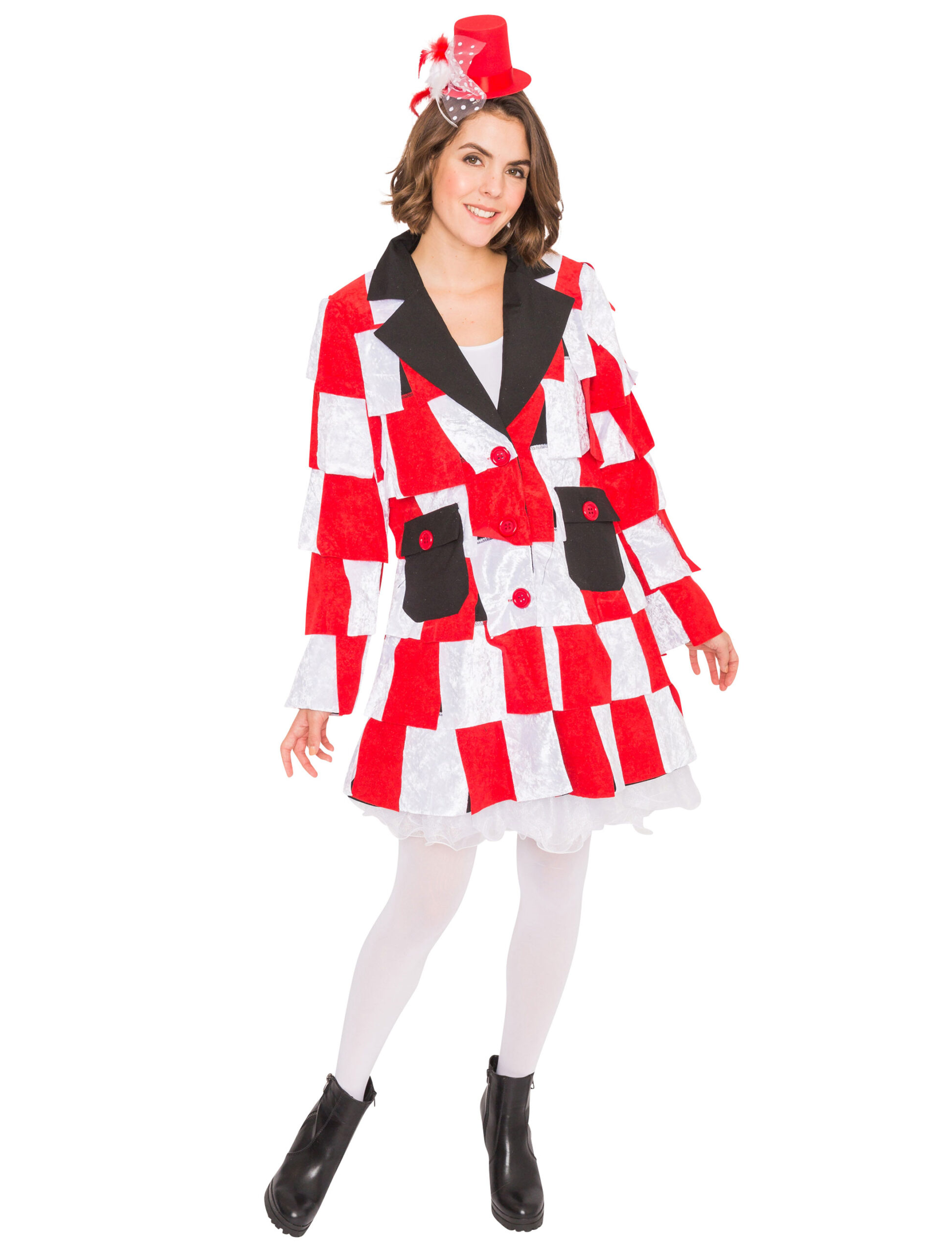 Von wegen Lappen sind nur zum Putzen da! Diese Lappen überzeugen Dich vom Gegenteil. Denn sie machen diese Damen Jacke zum exklusiven Blickfang. Die etwas länger geschnittene Jacke ist rundum mit roten und weißen Lappen verziert, die abwechselnd angeordnet sind und somit einen tollen Kontrast zueinander bilden. Da die Lappen nicht an allen Seiten befestigt sind, schwingen diese bei Deinen Bewegungen schön mit und verleihen Dir Schwung und Leichtigkeit. Der tiefe Kragen der Damen Jacke besteht aus einen schwarzen Stoff. Auch die frontalen Taschen sind aus einem schwarzen Stoff gefertigt. Zusätzlich sind diese mit jeweils einem roten Knopf verziert. Durch ebenfalls rote Knöpfe in der Front lässt sich die Damen Lappen Jacke bequem schließen. Diese Jacke ist das Highlight für jede Party! Durch die Farbgebung eignet sie sich auch perfekt für Köln Kostüme!