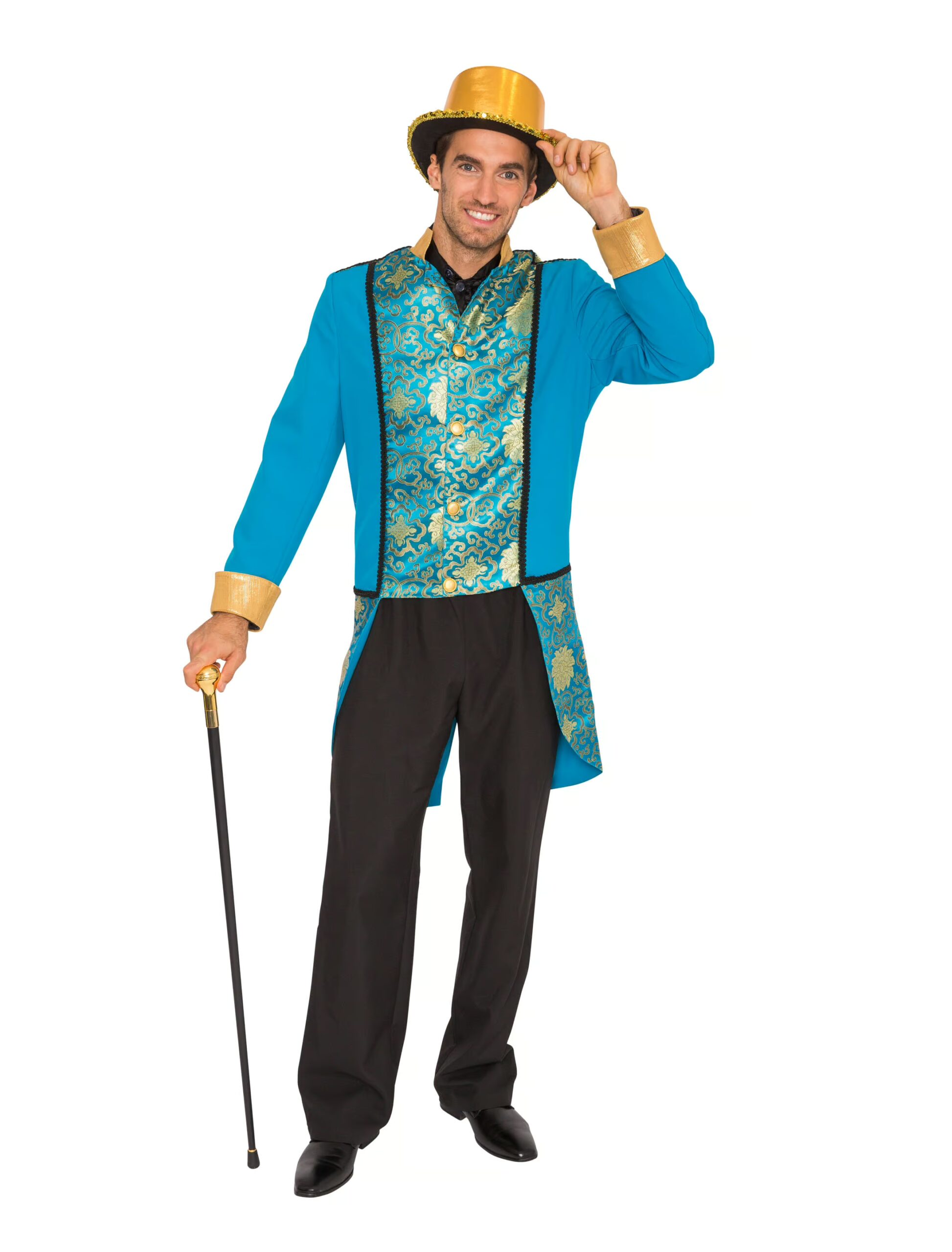 Mit unserer edlen Herren Jacke im Rokoko Stil bist Du auf jeder Karnevalsparty ein gern gesehener Gast. In den Farben Türkis und Gold ist die Jacke ein wahrer Augenmagnet und verwandelt Dich in einen wahren Gentleman, dem die holden Damen gerne hinterher schauen. Dabei darf natürlich auch der passende Zylinder in Gold nicht fehlen, den Du kurz zur Begrüßung abnehmen kannst. Die Jacke geht länglich über die Hüfte und hat ein tolles Muster für die Partynacht. Die Jacke wird vorne mit vier goldenen Knöpfen verschlossen.