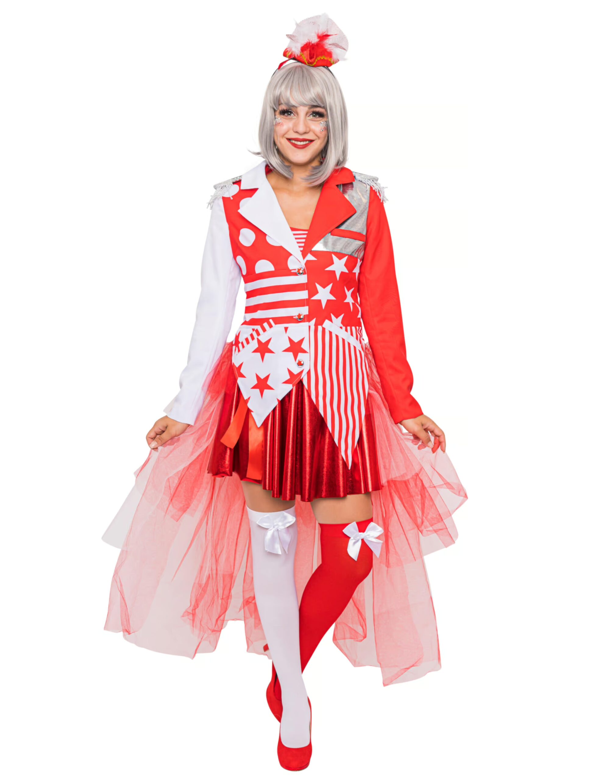 Als charmante Lady Karneval bist Du in dieser originellen, rot-weißen Damenjacke mit der dekorativen Schleife auf der Rückseite und den passenden Kostümteilen aus unserem Shop, das Highlight jeder närrischen Motto- und Kostümparty, das von den Herren angehimmelt und von den Damen beneidet wird. In dieser figurbetonenden Jacke mit dem roten und weißen Revers, der Knopfleiste, den asymmetrisch geschnittenen Vorderteilen in verrücktem Patchwork aus rot-weiß gepunktetem und gestreiftem Stoff, den silbernen Schulterklappen sowie einem weißen und einem roten Ärmel bist Du die perfekte Karnevalslady, die von allen geschätzt und bewundert wird.