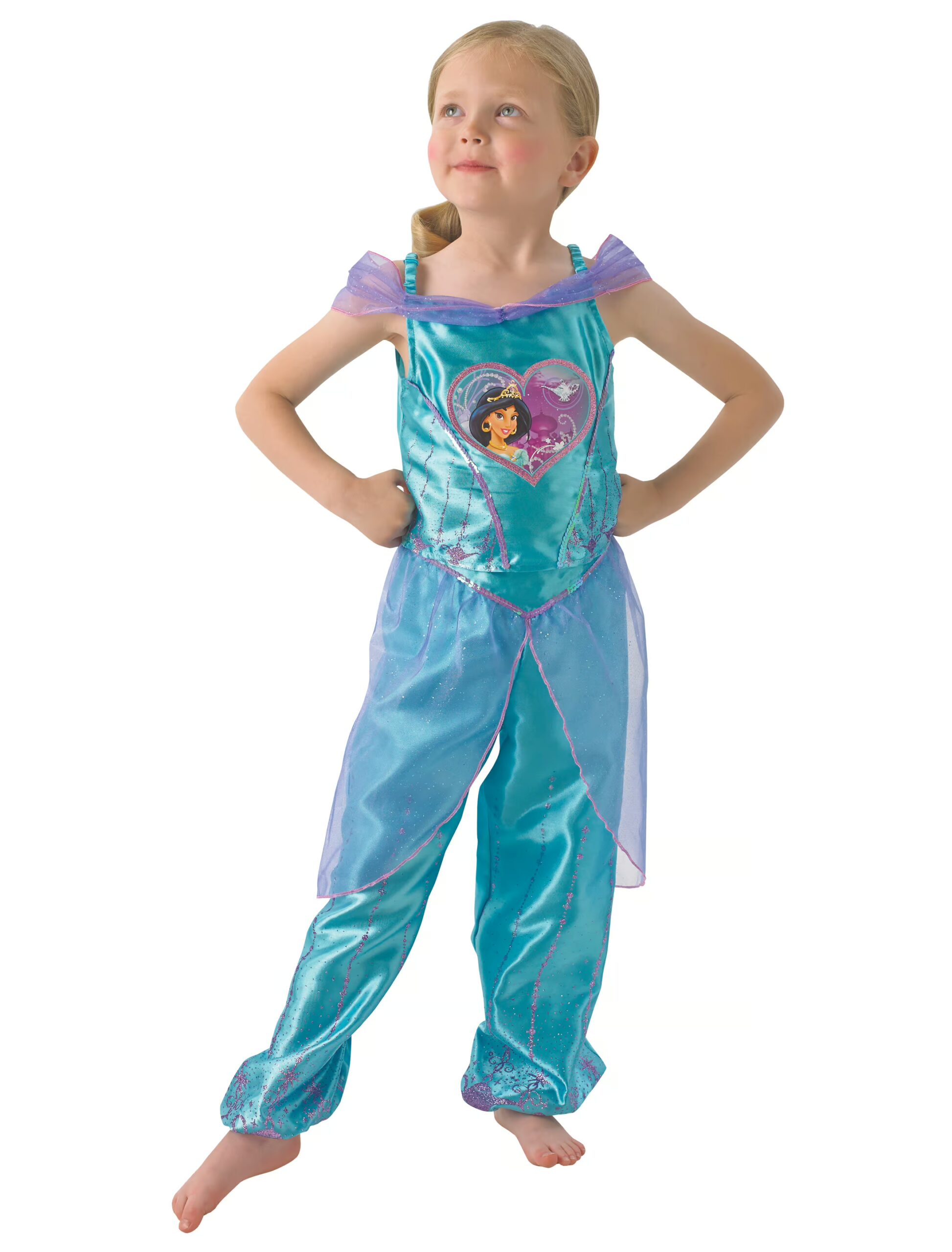 Wie aus tausend und einer Nacht! Mit diesem Kostüm verbreitest Du jede Menge Disney-Flair auf jeder Karnevalsparty! Deine zweiteilige Kostümierung als Prinzessin Jasmine besteht aus einem türkisen Top und einer langen, türkisen Hose. Beide Kleidungsstücke sind mit rosafarbenem Tüll verziert: Das Top an den Ärmeln und die Hose von der Hüfte bis zum Knie. Zusätzlich werden beide von rosafarbenen Applikationen/Mustern geziert. Hingucker ist das Herz in der Front, das die hübsche Prinzessin Jasmine und eine Wunderlampe zeigt. Ein rundum magisches Kostüm, das Du am liebsten nie mehr ausziehen möchtest! Aladdin. Dschinni. Bei diesem Kostüm handelt es sich um offiziellen DISNEY Merchandise!