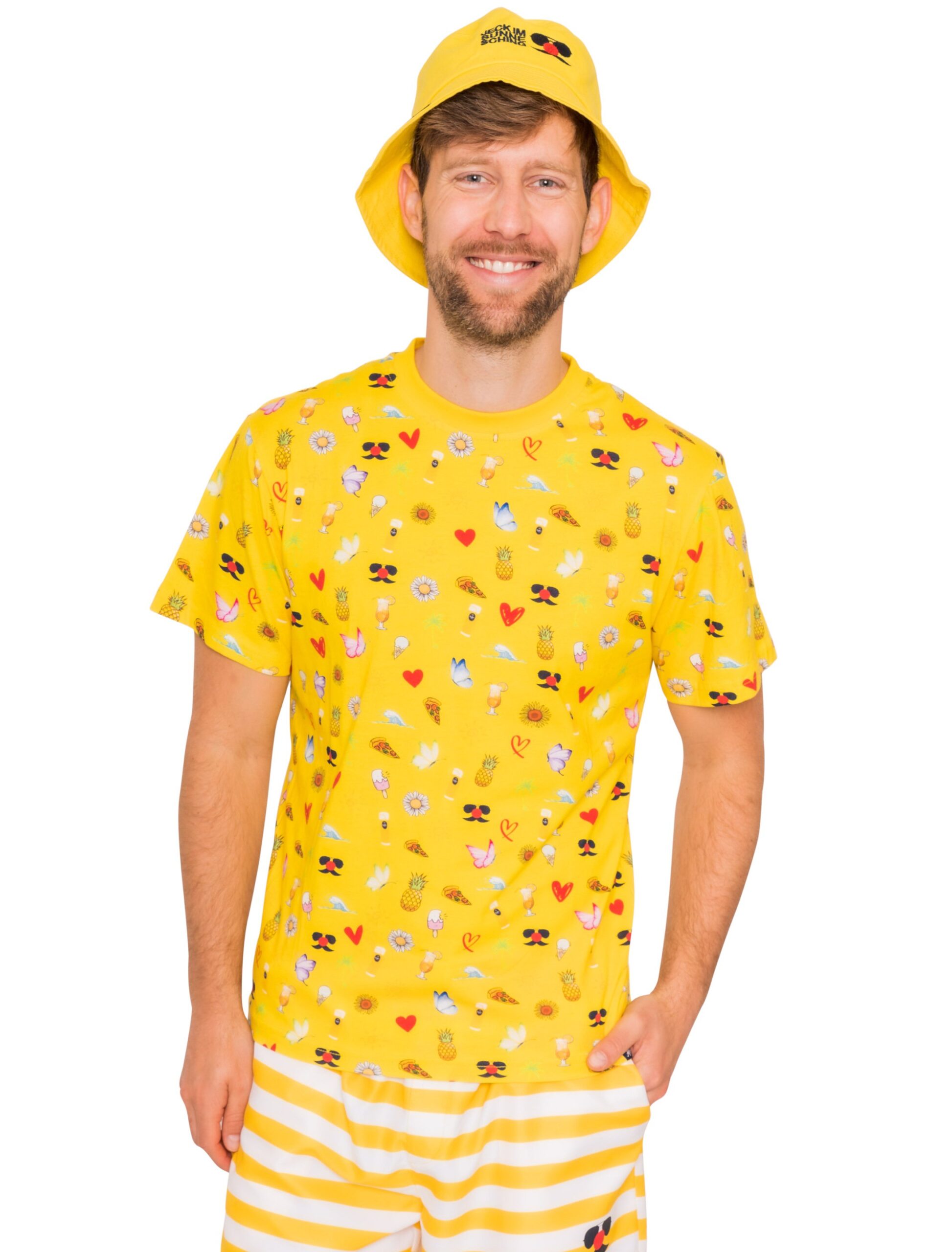 Dieses Original Jeck im Sunnesching T-Shirt mit Logos für Herren besteht aus reiner Baumwolle und ist mit sommerlichen Motiven bedruckt wie Eis, Palmen, Pizza, Cocktail, etc. sowie natürlich dem Jeck im Sunnesching-Logo und mehreren Gaffel Kölschgläsern. Ein sommerliches Kleidungsstück für die nächste Sommer- oder Grillparty! Unser Model ist 184 cm groß und trägt das T-Shirt in Größe M.