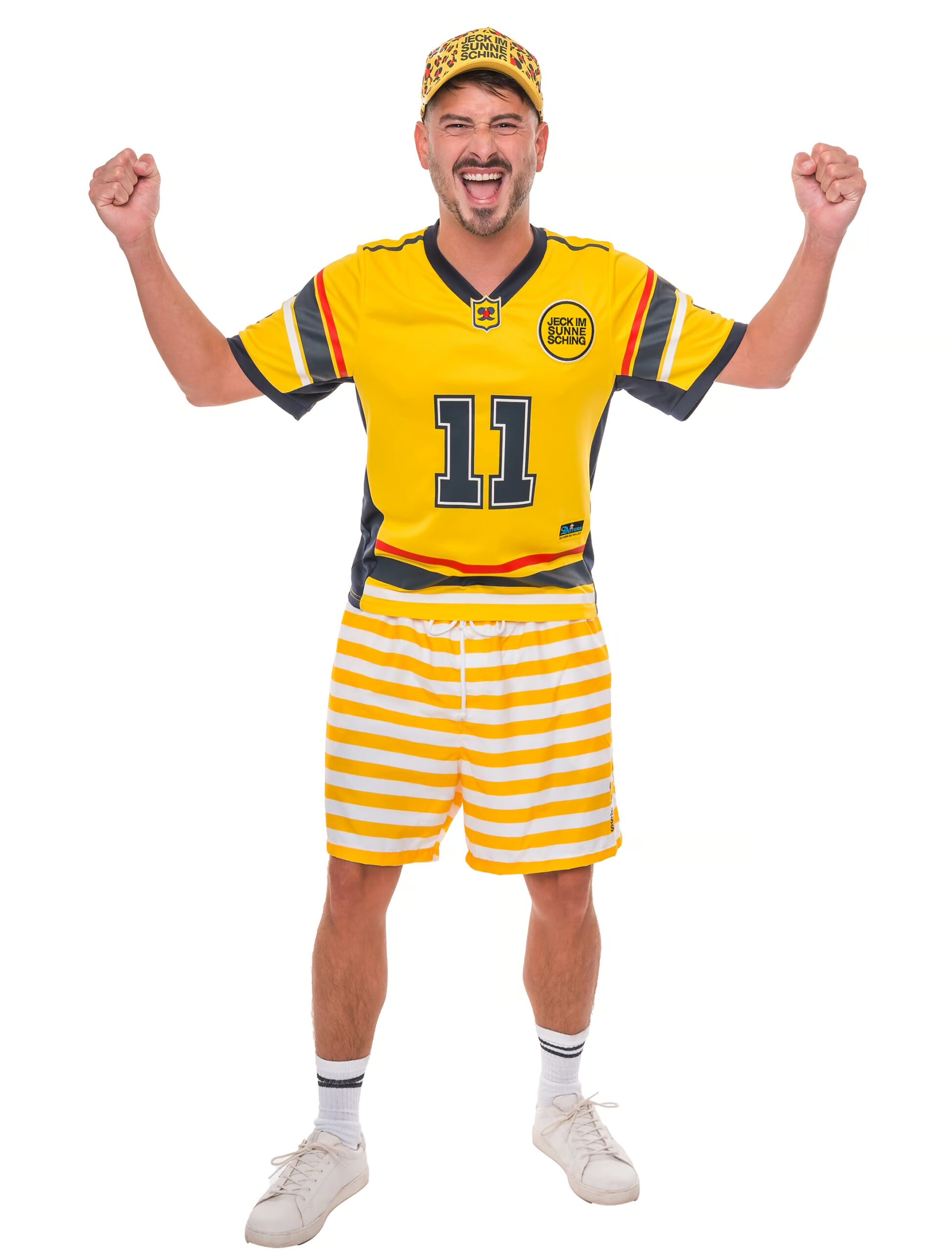 Unser auffälliges Trikot ist ein echtes Statement für alle Jecken! Vorne zeigt es stolz die Nummer 11 sowie einen großen Patch mit der Aufschrift ‘Jeck im Sunnesching’ auf der rechten Brust. Am Kragen ist zusätzlich das Logo des beliebten Events als hochwertiger Patch eingearbeitet. Unten rechts rundet ein Deiters Patch das Design ab. Auf der Rückseite prangt in großen Buchstaben das Wort ‘JECK’, ebenfalls begleitet von der Nummer 11. Perfekt, um gemeinsam mit anderen Jecken kölsche Musik abzufeuern, zu singen, zu schunkeln und sich zu verkleiden – dieses Trikot bringt echte Sommerfestival-Freude auf den Punkt!
