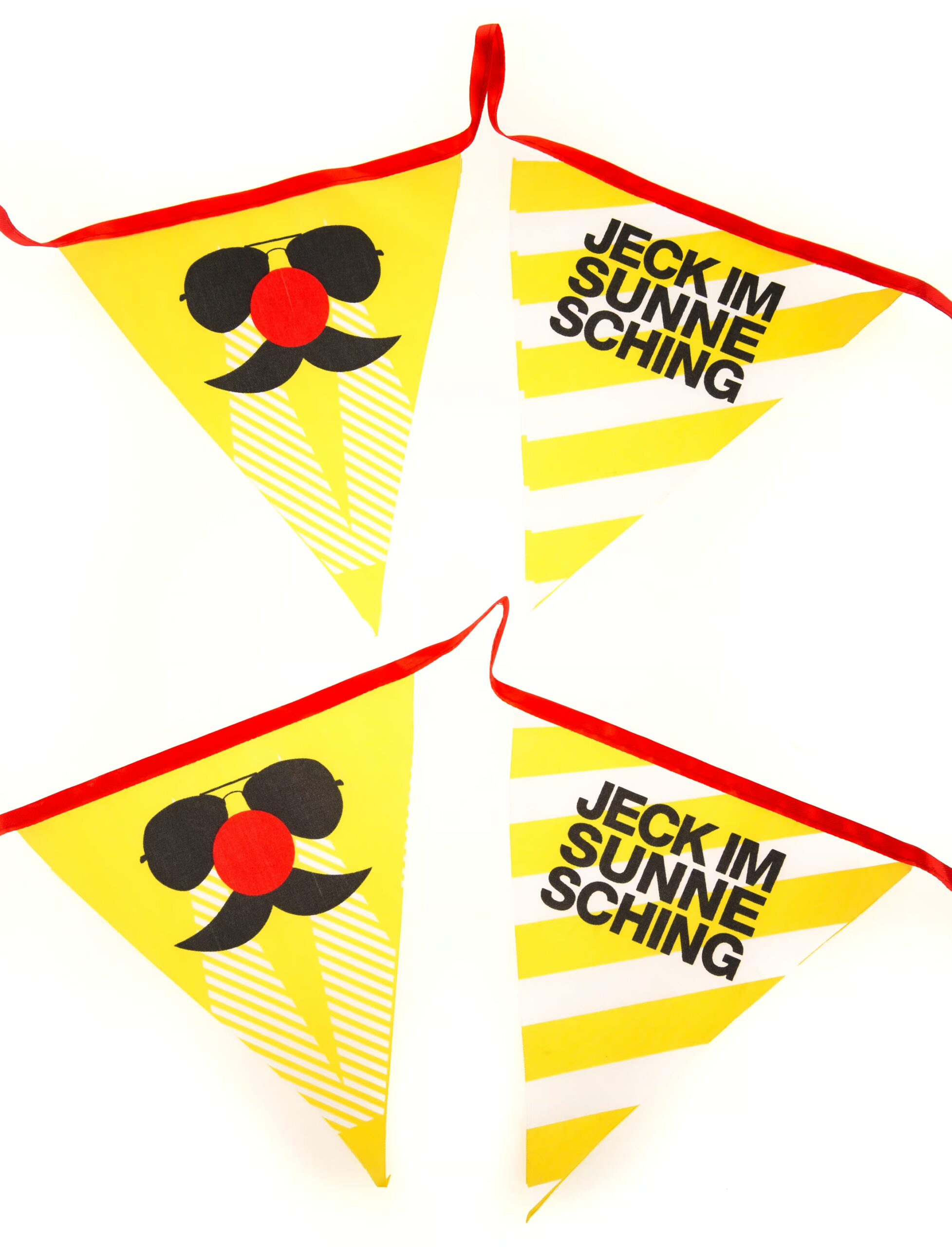 Jeck im Sunnesching vereint durch ein riesiges Festival Karneval und Outdoor Party miteinander! Um für den zusätzlichen Festival-Flair zu sorgen, kannst Du Deinen Garten oder den Park ganz einfach mit dieser tollen, fröhlich-gelben Wimpelkette schmücken. Mit ihrer 6-Meter-Länge lässt sie sich bequem an Bäumen, Sträuchern oder am Balkongeländer befestigen. Alle Fähnchen sind entweder mit dem Schriftzug JECK IM SUNNESCHING oder mit dem coolen Sonnenbrille-Pappnase-Schnäuzer-Gesicht verziert! Die Wimpelkette enthält 24 Wimpeln. Maße der Wimpel: ca. 20 x 21,5 cm. Länge: 6 m.