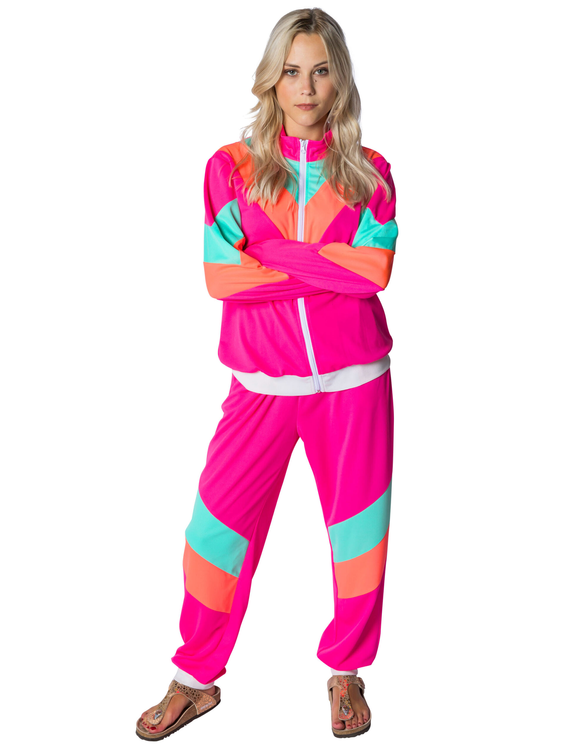 Du willst den anderen Feiernden an Karneval zeigen, wer im Hochhausviertel das Sagen hat? Dann bestelle noch heute unseren sportlichen Jogginganzug für Damen im knalligen Pink. In mehreren Größen lässt sich der Anzug bei uns im Shop bestellen, der aus einer Jacke und einer Hose besteht. Mit einem Reißverschluss kannst Du die Jacke vorne leicht schließen. Mit der passenden Bierdose in der Hand rundest Du das Outfit als Oberproll perfekt ab. Die Jacke ist aus einem atmungsaktiven Mesh-Stoff gefertigt und besitzt vorne einen Reißverschluss. Die Hose hat einen Gummizug am Hosenbund und besitzt zwei vordere Taschen, die nicht zu verschließen sind. 80er Jahre Kostüm.