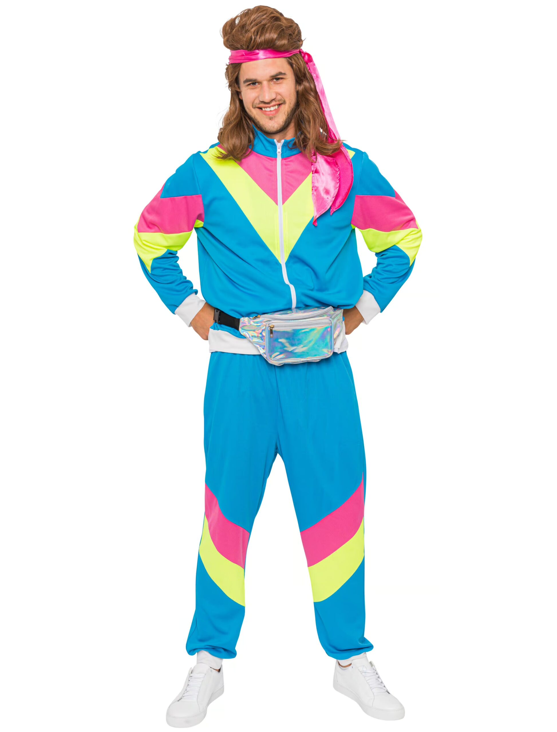 Erobere die Tanzfläche der nächsten 80er-Jahre-Party im Sturm. Der blaue Jogginganzug für Herren macht Dich zum Discofox-King. Gefertigt ist das zweiteilige Set aus leichtem 100% Polyesterstoff. Auffällige neongelbe und pinkfarbene Zierstreifen sind der Hingucker. In die Hose mit Gummizug und zwei Taschen kannst Du schnell hineinschlüpfen. Die zugehörige Jacke ist vorne mit einem Reißverschluss versehen. Wähle Deinen Jogginganzug aus drei Größen aus, die für Jugendliche und Erwachsene passen. Im Shop gibt es noch viel Zubehör, das den Anzug ergänzt. Ein cooles Stirnband, eine Sonnenbrille und eine Glitzer-Bauchtasche sind TOP!