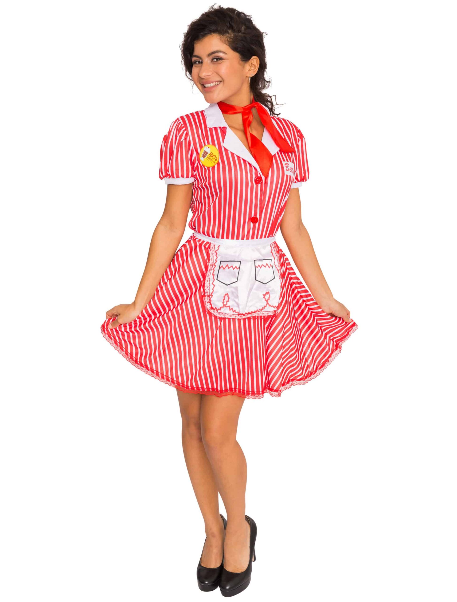 Die wilden 50er sind zurück! Mit unserem Retro Kellnerin Kostüm für Damen im gestreiften Look kannst Du den Gästen auf der Mottoparty leckere Getränke servieren und zusammen mit ihnen abfeiern. Neben dem Kleid erhältst Du auch ein rotes Halstuch und einen 50er Jahre Pin für Dein Kellnerin Kleid. Auch eine Haube ist im Set enthalten, die Du leicht auf dem Kopf tragen kannst. Zeige den anderen Party People, wer die Königin der Tabletts ist und wer am besten leckere Pancakes servieren kann.