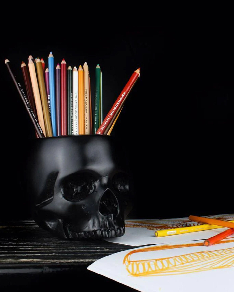 Totenkopf Behälter ohne Unterkiefer Okkulte Aufbewahrungsmöglichkeit für deine Gruft In unserem Totenkopf Behälter ohne Unterkiefer kommen zahlreiche Utensilien stilvoll zur Geltung. Er hält deine Stifte im Büro und deine Küchenartikel in der Kochnische. Ein Multitalent für alle, die das Okkulte lieben. Unser Totenkopf Behälter ohne Unterkiefer stammt aus dem Hause The Blackened Teeth UK. Er ist aus Gips gefertigt und verfügt über eine Öffnung an der Oberseite. Diese lässt sich mit Stiften, Küchenutensilien und ähnlichem bestücken. Lieferumfang: 1 x Totenkopf Behälter ohne Unterkiefer Farbe: Schwarz Größe: ca. 12 x 18 x 13 Gewicht: 2,7 kg Material: Gips made by the Blackened Teeth UK Der Artikel ist ein Dekoartikel