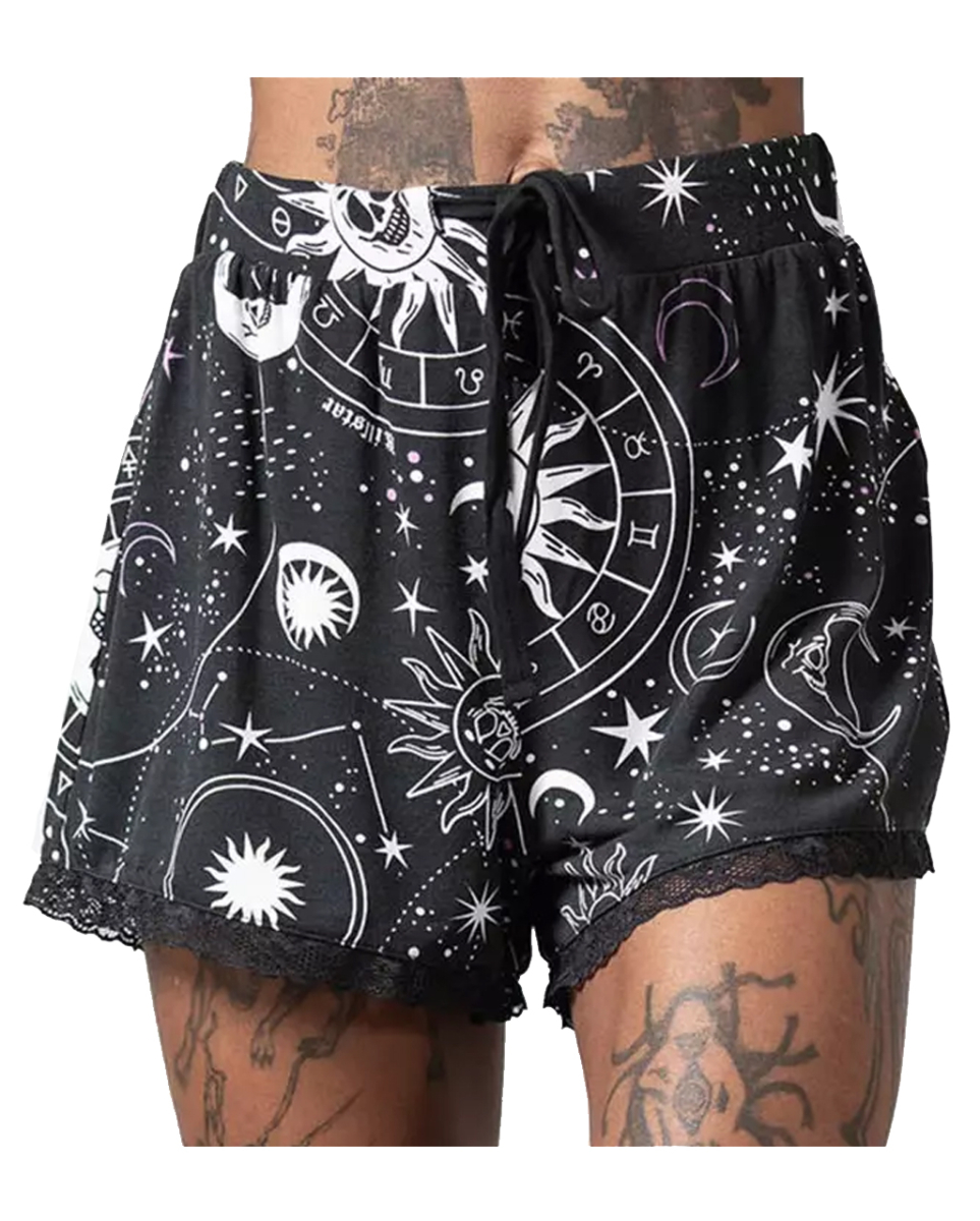 Cosmos Shorts von Killstar Gemütliche Kosmos Damen Shorts in Schwarzweiß Mach es dir zuhause gemütlich und trage bequeme Gothic Mode von KILLSTAR! Unsere Cosmos Shorts von KILLSTAR zeigt Sonne, Mond und Sterne als galaktischer Allover Print – ein Highlight in jedem Wäscheschrank. Du erhältst die schwarzweiße Damen Shorts in Größe XS bis 4XL. Die Hose verfügt über süße Spitzen Details sowie ein Gummiband für mehr Komfort. Weiches Material und Dehnbarkeit machen diese Shorts zum Lieblingsteil. Lieferumfang: 1 x Cosmos Shorts KILLSTAR Farbe: Schwarz, Weiß, Lila Größe: XS,S,M,L,XL,XXL,3XL,4XL Material: 95% Viskose, 5% Elasthan Gemütliche Gothic Shorts für Damen Stoff Shorts mit Astro Aufdruck Spitzen Applikation Elastisches Gummiband Nicht für Kinder unter 3 Jahren geeignet. Kann Kleinteile enthalten, die verschluckt werden können – Erstickungsgefahr.