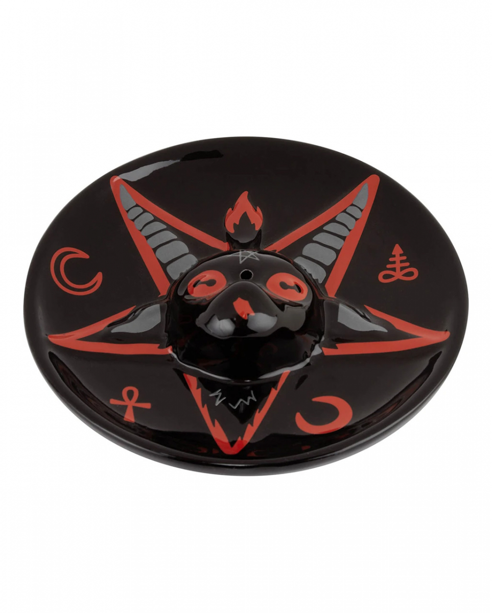 Pentagramm Räucherstäbchenhalter ",Dark Haze", von KILLSTAR Verschenke das okkulte Wohnaccessoire mit Baphomet Motiv an einen Gothic und Halloween Fan Ergänze deine Krypta, deinen Altar oder einfach nur dein Büro mit dem einzigartigen Pentagramm Räucherstäbchenhalter ",Dark Haze", von KILLSTAR. Der mystische Geist Baphomets wird deine dunkler Seele animieren, ganz sie selbst zu sein. Perfekt zum Verschenken oder Selbstbehalten! Der Pentagramm Räucherstäbchenhalter ",Dark Haze", von KILLSTAR ist aus Keramik und besitzt eine schöne glänzende Oberfläche. Mystische Zeichen, das Pentagramm und Baphomet machen die okkulte Deko zum Hingucker. Lieferumfang: 1 x KILLSTAR Dark Haze Räucherstäbchenhalter Farbe: Schwarz, Rot Größe: ca. 15cm Durchmesser, 4 cm hoch Material: 100% Keramik KILLSTAR Räucherstäbchenhalter mit 3D Design Tiefschwarz glänzend mit roten Akzenten Gothic und Halloween Homeware