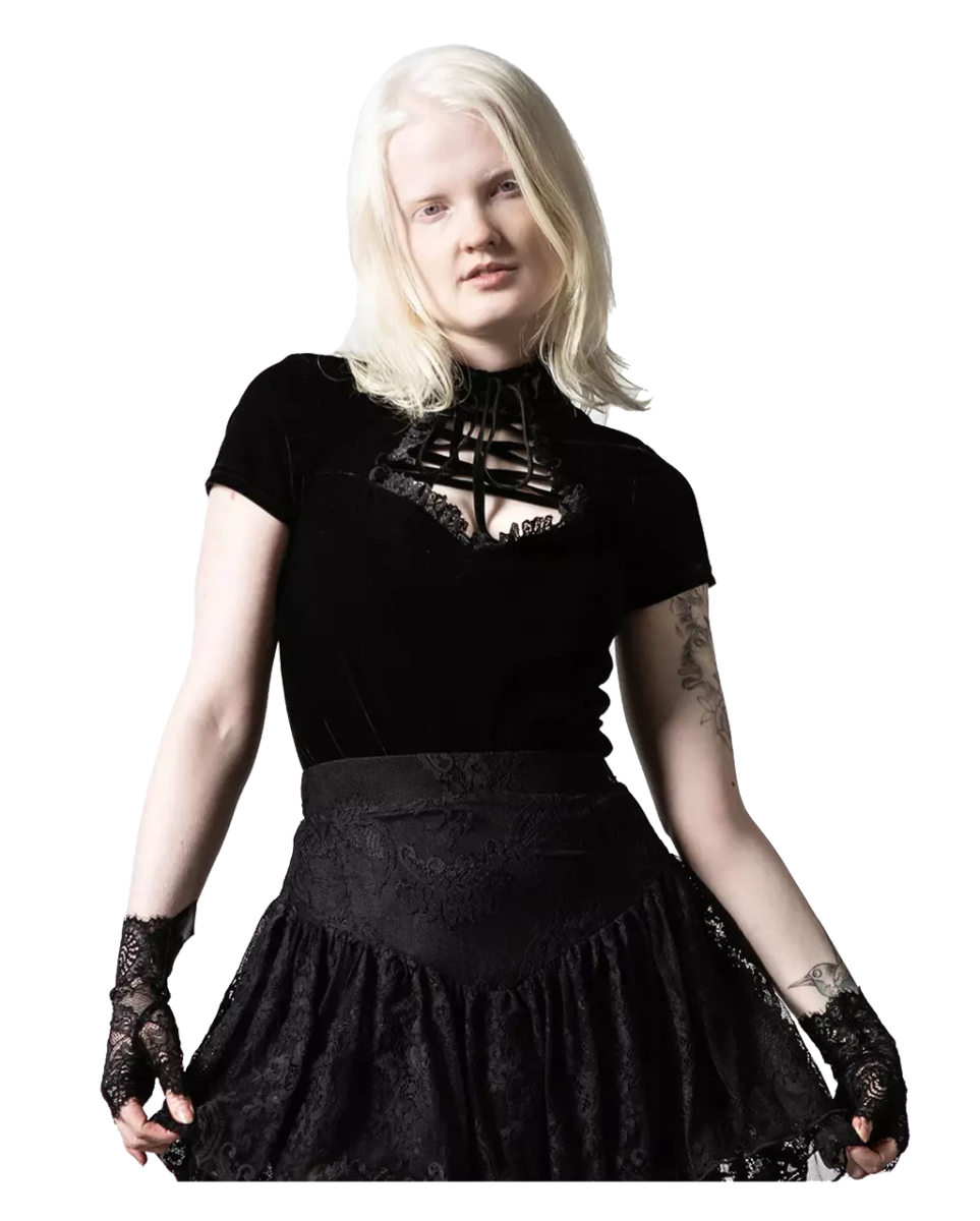 Schwarzes Malady Lace-Up Oberteil von KILLSTAR Sexy Gothic Schnür-Top mit Spitze und Bondage Look Mit dem schwarzen Malady Lace-Up Oberteil von KILLSTAR gibst du dich hoch geschnürt und dennoch umwerfend sexy. Das Schnür-Top umgarnt dich mit einer schmeichelhaften Passform. Das Gothic Oberteil ist perfekt für heiße Tage und noch heißere Nächte. Gönn dir das Malady Lace-Up Oberteil von KILLSTAR, um deinen Status als Gothic Queen zu unterstreichen. Der schwarze Body aus weichem Samt hat einen hohen Halsausschnitt. Das Highlight des Oberteils sind die Bondage Schnürung und die Spitzenbesätze. Lieferumfang: 1 x Schwarzes Malady Lace-Up Oberteil von KILLSTAR Farbe: Schwarz Größe: S, M, L Material: 90% Nylon, 10% Elasthan Raffiniertes Oberteil für Mix und Match Hochwertiger, schwarzer Samt Hoher Ausschnitt mit Spitzenbesatz Zusätzliche Strings im Bondage Look Tailliert, normale Länge Kalt waschen – Schonwaschgang Größe: S M L EU 38 40 42 UK 10 12 14 US 6 8 10 Brustumfang: ca. 87 cm ca. 92 cm ca. 97 cm Taillenumfang: ca. 69 cm ca. 74 cm ca. 79 cm Hüftumfang: ca. 94 cm ca. 99 cm ca. 104 cm Der Artikel ist ein Oberteil für Erwachsene und kein Spielzeug. Nicht für Kinder unter 3 Jahren geeignet. Kann Kleinteile enthalten, die verschluckt werden können – Erstickungsgefahr. Von Feuer und offenen Flammen fernhalten.