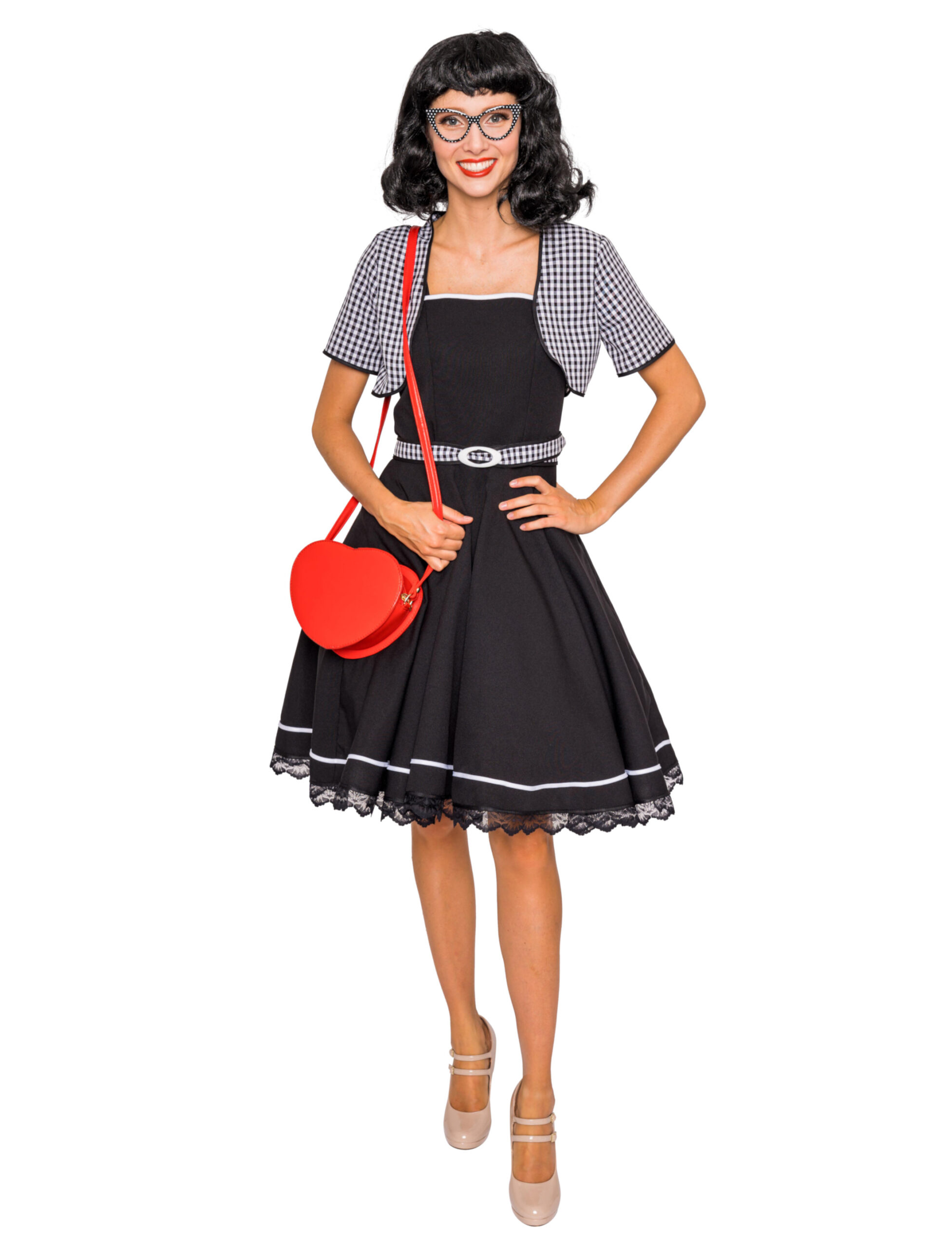 Back to the 50’s, back to the roots! Dieses 50er-Jahre-Kleid ist einfach nur bezaubernd und bis ins kleinste Detail durchdacht: Das Kostüm besteht aus einem schwarzen, knielangen Kleid, das weit ausgestellt ist und am Saum mit schwarzer Spitze und einer weißen Borte verziert ist. Der dazugehörige Bolero passt mit seinem schwarz-weiß-karierten Muster perfekt zum ebenfalls kariertem Gürtel. Fehlen nur noch die passenden Schuhe und ein Haarreif und schon kannst Du auf der kommenden Karnevals- oder Mottoparty Dein Tanzbein und Dein Kleid schwingen!