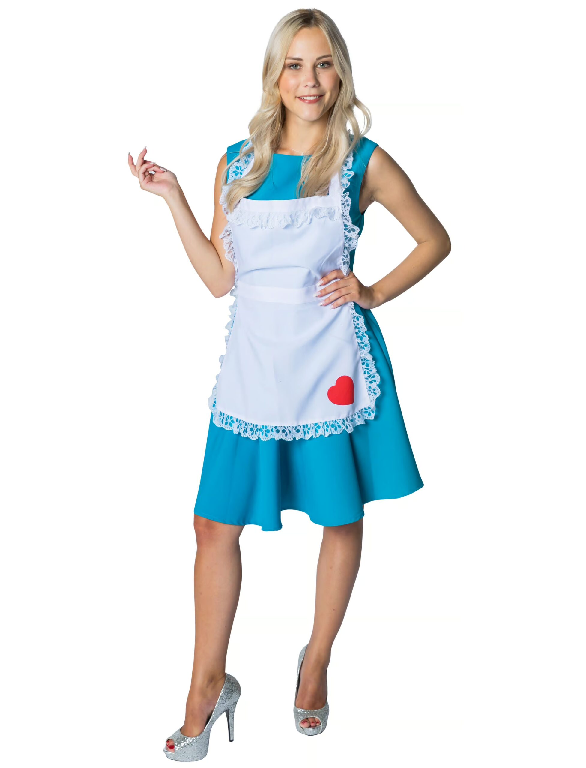 Begib Dich an Karneval auf eine märchenhafte Mottoparty, verkleidet mit unserem Set für Damen. Das zweiteilige Outfit besteht aus einem schicken Kleid, das zusammen mit einer Schürze geliefert wird. Die weiße Schürze hat ein niedliches rotes Herz und passt ideal zu dem hellblauen Kleid Alice. Auch auf Mottopartys kannst Du die clevere Kombination prima tragen und eine Feier zusammen mit Deinen besten Freunden und dem verrückten Hutmacher veranstalten. Das Kleid ist ärmellos und besitzt einen Reißverschluss am Rücken. Auf der Schürze ist ein Herz bedruckt. Sie kann hinter dem Rücken verbunden werden.