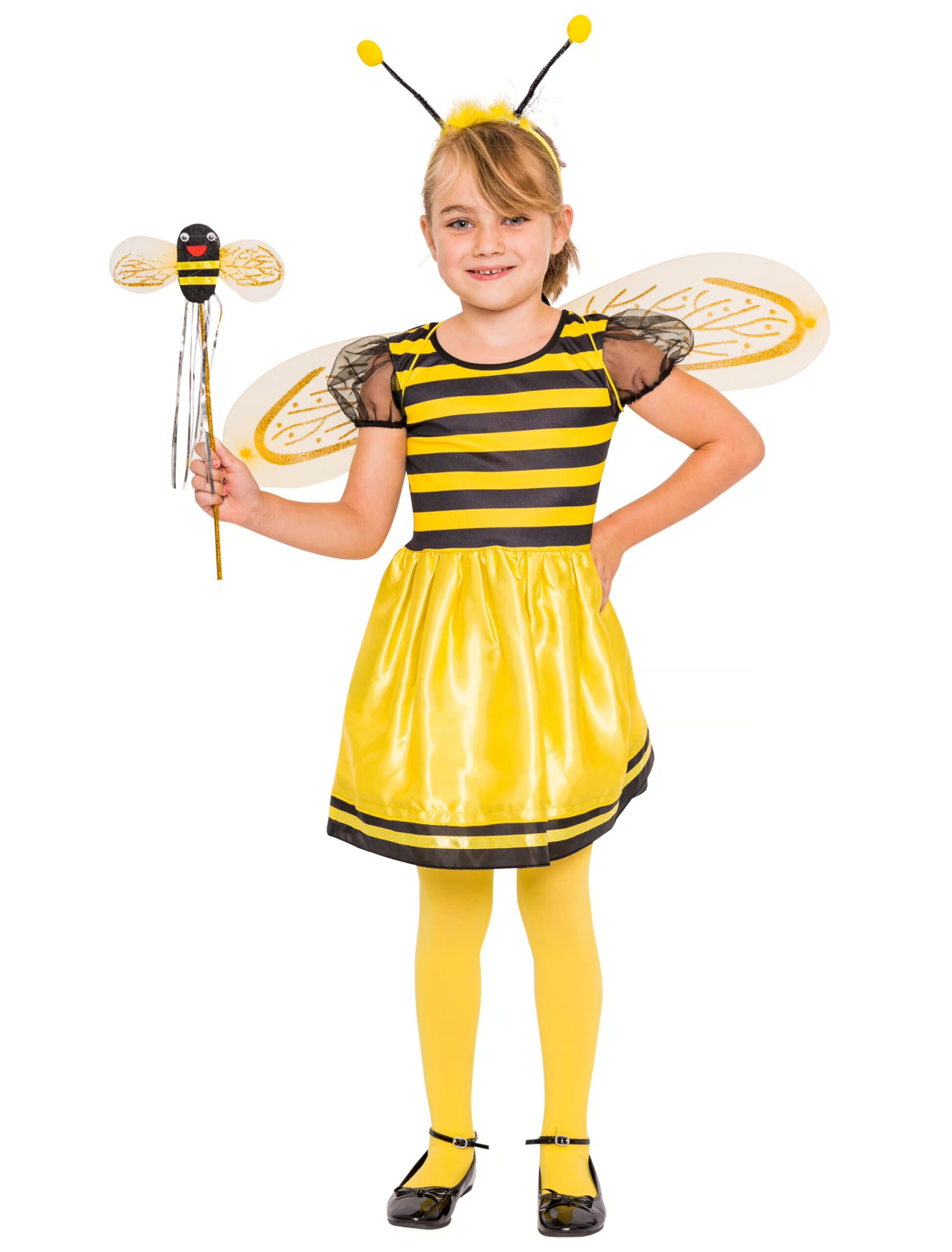 Kleine Summsis aufgepasst – mit diesem schwarz-gelb gestreiften Kinder Bienen Kleid seid ihr garantiert der Hingucker auf jedem Kostüm Event. Das Kleid ist sehr luftig, angenehm zu tragen und besteht durch die gute Verarbeitung des Polyesterstoffes auch den Karnevalstest. Toben, springen, rennen – nichts hält die Kinder in diesem Kostüm davon ab eine Menge Spaß auf jeder Party zu haben. Das Kinder Bienchen Kleid eignet sich besonders gut für alle Kinder, die schon immer einmalig ein süßes Bienchen sein wollten. Strahlende Augen, Spaß und Freude sind so garantiert.