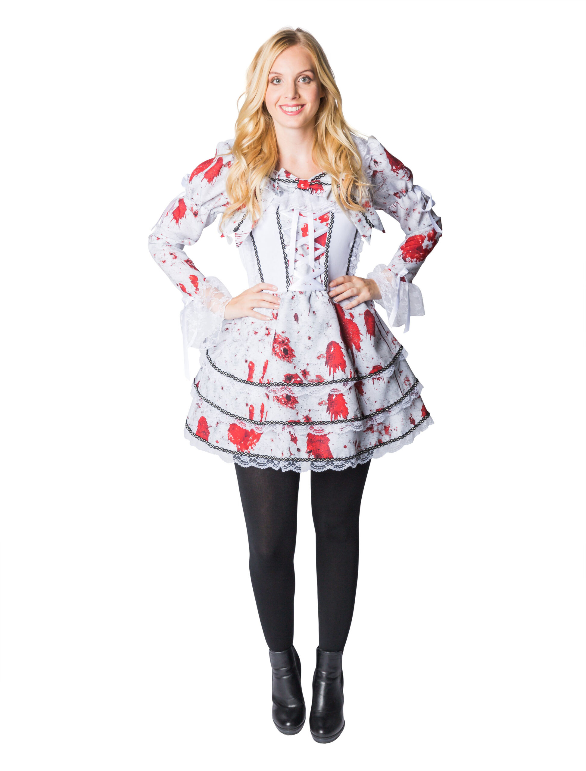 Willkommen zur wohl blutigsten Hochzeit aller Zeiten! Dieses Damen Braut Kleid ist das perfekte Kostüm für alle Halloweenpartys und schaurigen Mottopartys. Das Kleid besteht aus einem weißen Stoff, der rundum mit schwarzen Nähten, mit hübscher Spitze, auffälligen Schnürungen und vielen roten Flecken, die aussehen wie Blut, verziert ist. Der kurze Schnitt und der weit ausgestellte Rock betonen perfekt Deine Hüfte und Deine Beine. Ein schaurig-schönes Kostüm für alle Zombie- und Halloween-Fans!