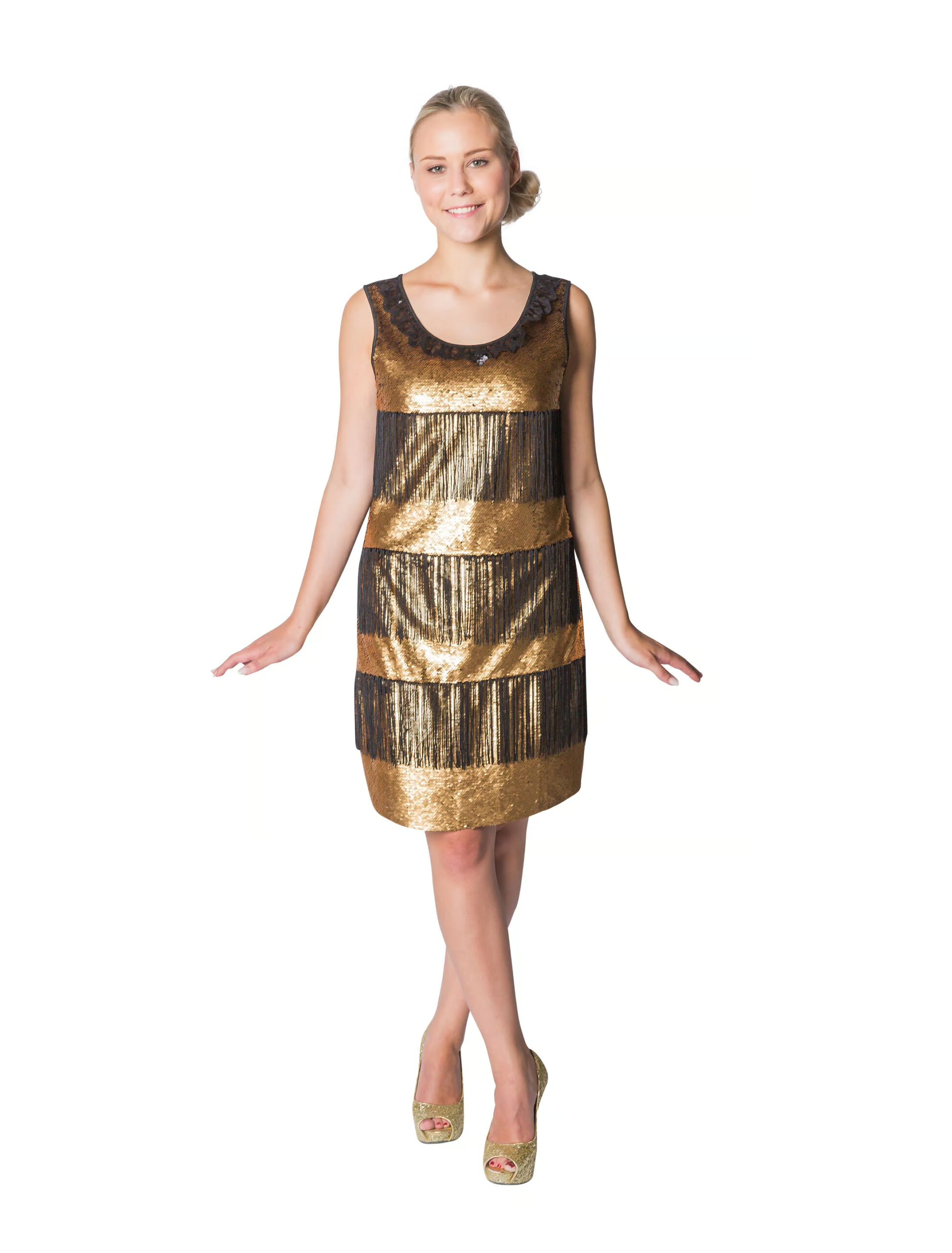 Mach’ es wie Josephine Baker und lass’ den berühmten Charleston-Tanz wieder aufleben! Dieses hübsche Kleid bringt die perfekten Voraussetzungen für den schnellen Gesellschaftstanz mit: Ein goldener, glänzender Stoff und viele schwarze Fransen, die sich bei jeder Bewegung hin- und herbewegen. Das Dekolletee ist passend zu den Fransen mit schwarzer Spitze verziert. Die Rückseite besteht aus einem einfachen Stoff, der etwas länger geschnitten und abgerundet ist. Möchtest Du die Vorderseite statt Gold eher in Schwarz oder doch umgekehrt? Durch die Wendepailletten ist das jetzt möglich. Fahre einfach mit der Hand von unten nach oben oder von oben nach unten, um Deinen Kleidungs-Stil zu entdecken. Ein tolles Kleid für die kommenden Tanz- und Karnevalspartys!