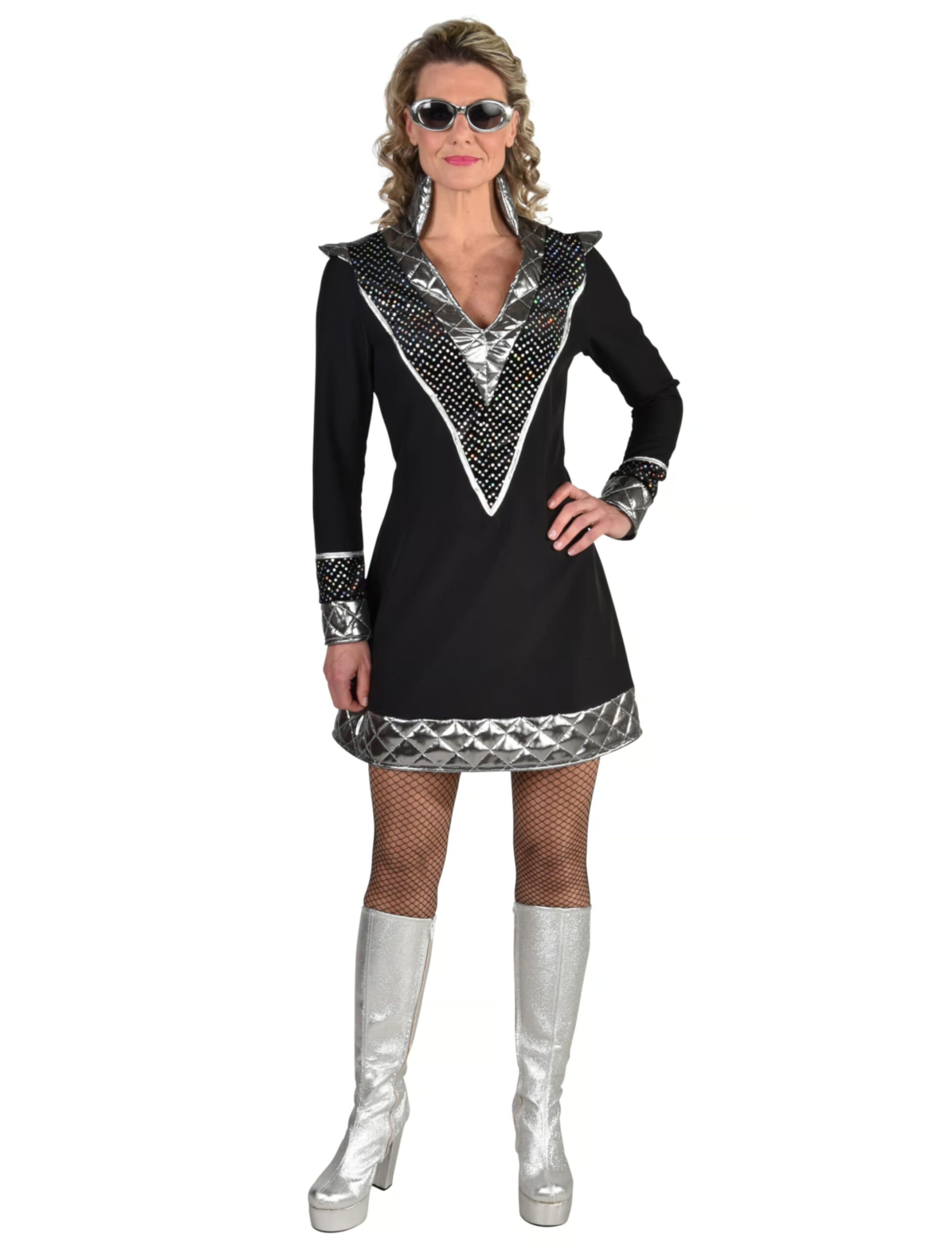 In diesem glamourösen Disco Kleid, kombiniert mit silberfarbenen Stiefeln und auffälligem Schmuck aus unserem Shop, bist Du die unumstrittene Disco Queen, die die Männer magisch in ihren Bann zieht. Das kurze, figurbetonte schwarze Kleid mit den langen Ärmeln und dem aufwendigen, silbernen Paillettenbesatz sowie den schönen silbernen Steppstoffeinfassungen an Ausschnitt, Stehkragen, Ärmeln und Rocksaum ist nicht nur schick, sondern auch äußerst elegant. Ein glitzerndes und glänzendes Highlight, mit dem Du Dich aus der Menge bunter Kostüme auf Faschings- und Karnevalspartys garantiert hervorhebst und bewundernde Blicke von den Herren sowie neidische Blicke von den Damen erntest.