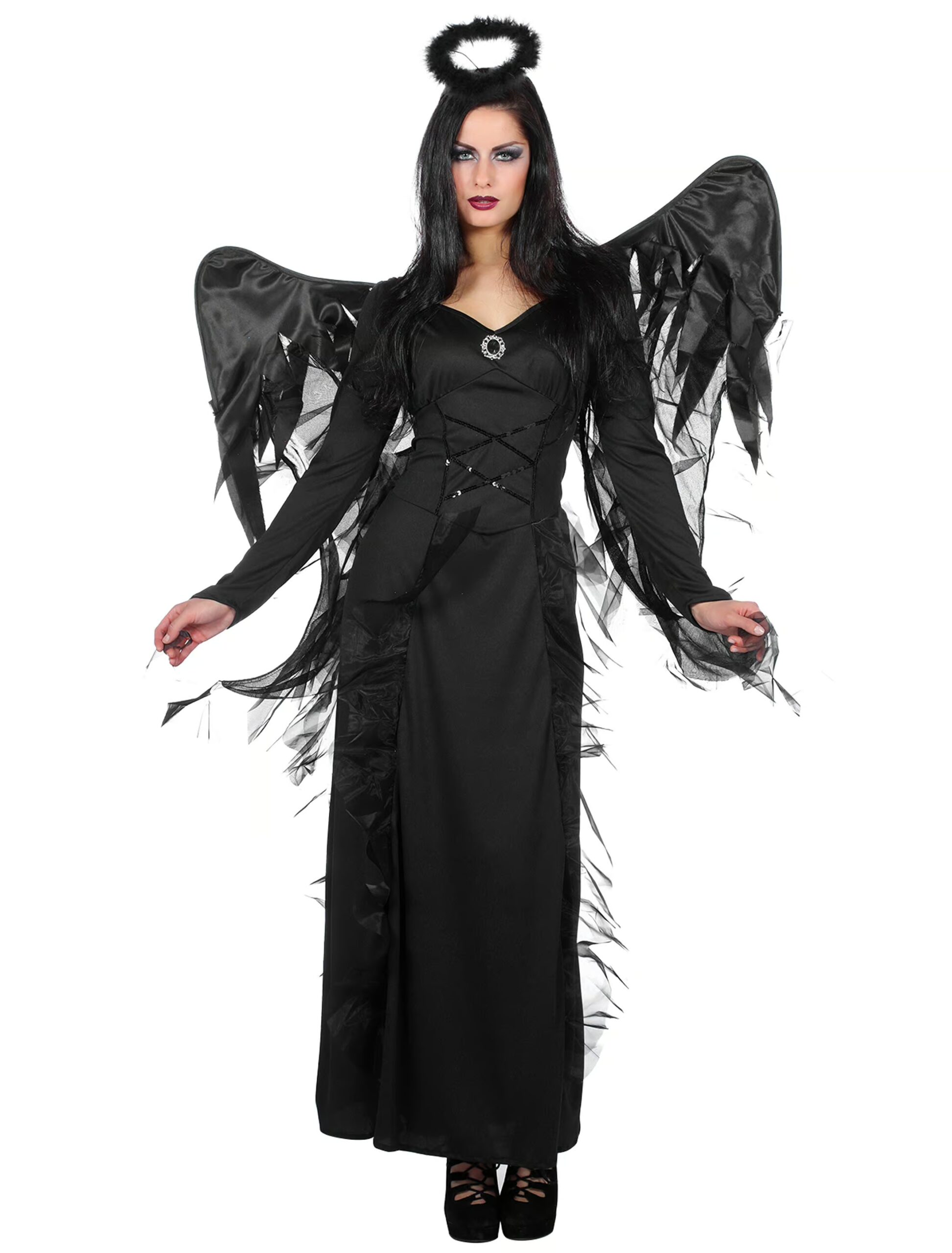 Nur langweilige Engel tragen weiß. Die wirklich aufregenden Engel bevorzugen Schwarz. Wenn Du so auf der nächsten Motto- oder Kostümparty erscheinst, dürfte wohl jedem klar sein, dass Du Dir die Zeit nicht damit vertreibst, auf einer Wolke irgendwelche Akkorde auf einer Harfe zu spielen. Das knöchellange Kleid mit der angedeuteten Corsagen-Optik betont auf aufregende Art und Weise Deine Figur und betört die Sinne des Betrachters. Die leicht zerfledderten Flügel unterstreichen Deine Art Menschen zu erschrecken und selbst Dein Heiligenschein glänzt in Schwarz. Mit diesem Kleid wirst Du viele arme Seelen einfangen und davon überzeugen, dass mit Dir selbst in der Hölle der Teufel los ist.