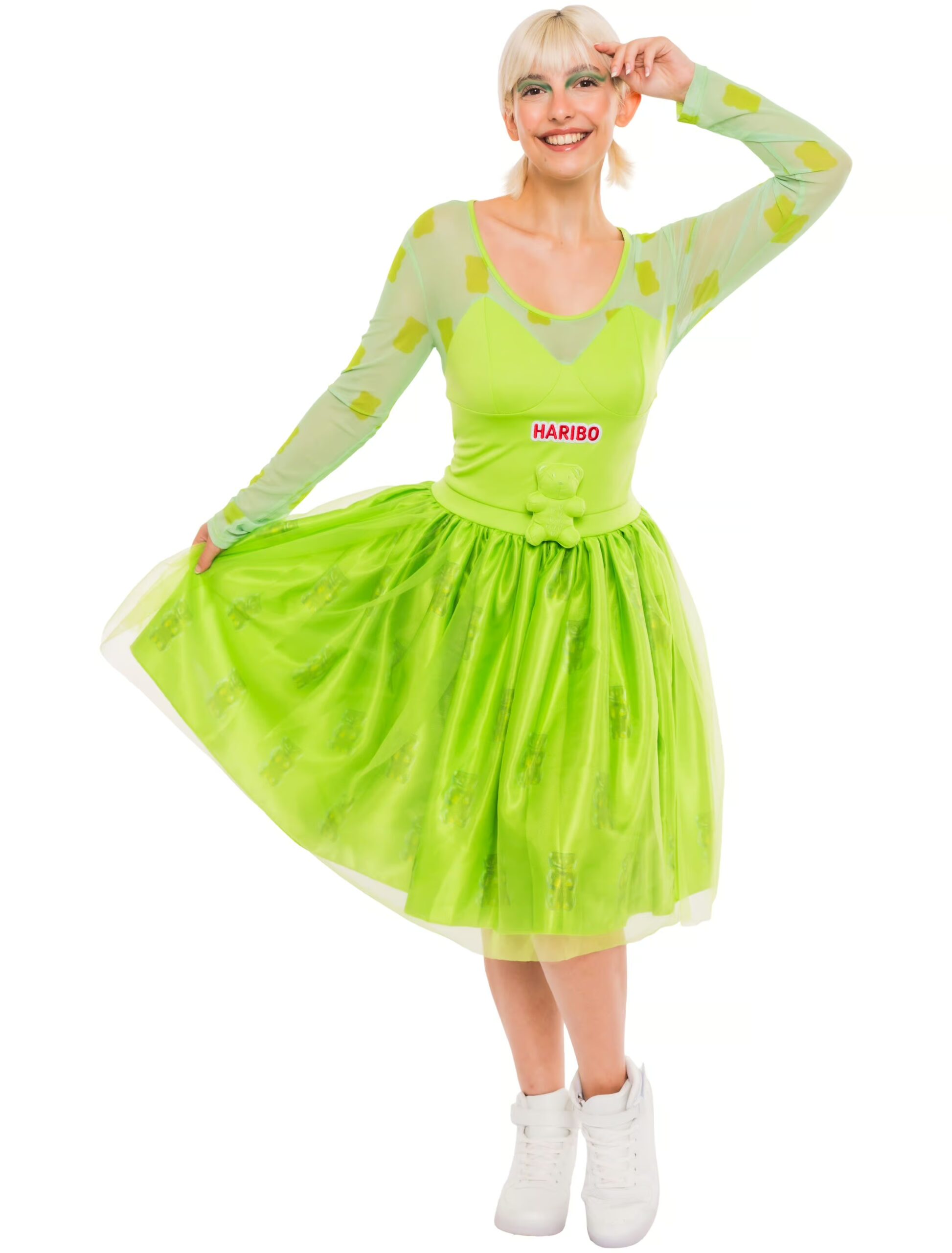Tauche ein in die fröhliche Süßigkeiten-Welt mit unserem exklusiven Kleid HARIBO Goldbären für Damen – erhältlich in den lebendigen Farben Rot, Orange, Grün und Gelb, exklusiv bei Deiters! Dieses bezaubernde Kleid ist nicht nur ein Kostüm, sondern auch eine Hommage an die beliebten HARIBO Goldbären. Das Kleid ist in verschiedenen Größen von S bis 2XL erhältlich, um sicherzustellen, dass jede Frau die Möglichkeit hat, sich in dieses farbenfrohe und verspielte Outfit zu begeben. Die Auswahl der Farben repräsentiert die Vielfalt der Goldbären und verleiht jedem Anlass eine süße und fröhliche Note. Egal, ob du auf einer Kostümparty strahlen, beim Karneval die Blicke auf dich ziehen oder einfach nur Spaß haben möchtest – dieses Kleid ist die perfekte Wahl. Es kombiniert Stil mit Komfort und besteht aus hochwertigem Material, das angenehm zu tragen ist. Mit dem Kleid HARIBO Goldbären für Damen setzt du nicht nur ein modisches Statement, sondern tauchst auch ein in die süße Welt der