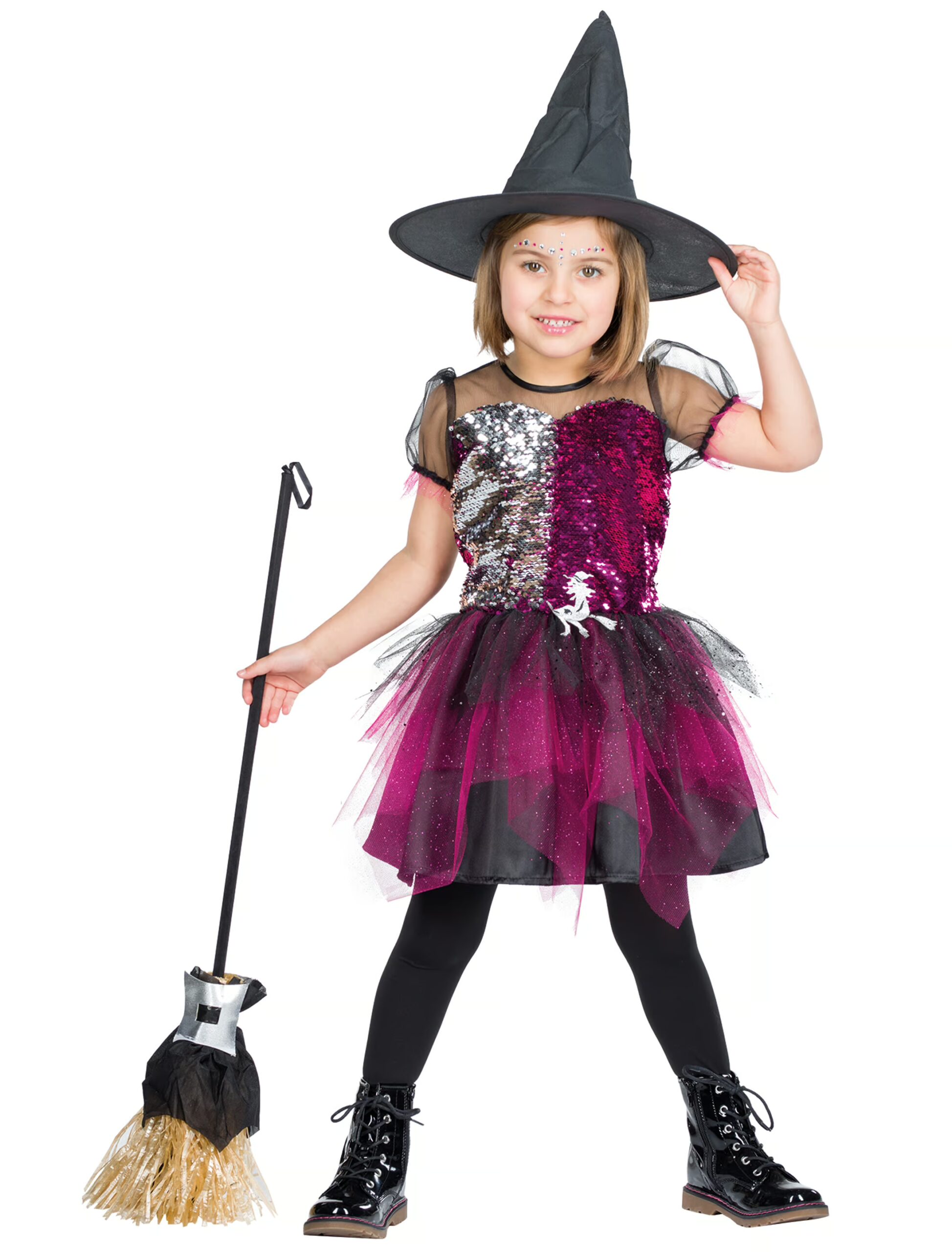 Süßes Hexen-Kleid, mit dem Du garantiert jeden verzauberst! Das hübsche Kostüm für Mädchen ist in der Front mit hübschen Glitzer-Pailletten verziert, die entweder in Silber oder in Pink glänzen. Der schwarze Rock wird von viel Glitzer-Tüll in Schwarz und Pink verziert und passt perfekt zum transparenten Stoff rund um Deine Schultern und Deinem Hals. Weitere Highlights Deines zauberhaften Hexen-Kostüms ist die Hexenbrosche in der Front und die hübsche, schwarze Schleife auf der Rückseite. Mit Hut und Besen machst Du Deine Halloween- oder Karnevals-Verkleidung perfekt!