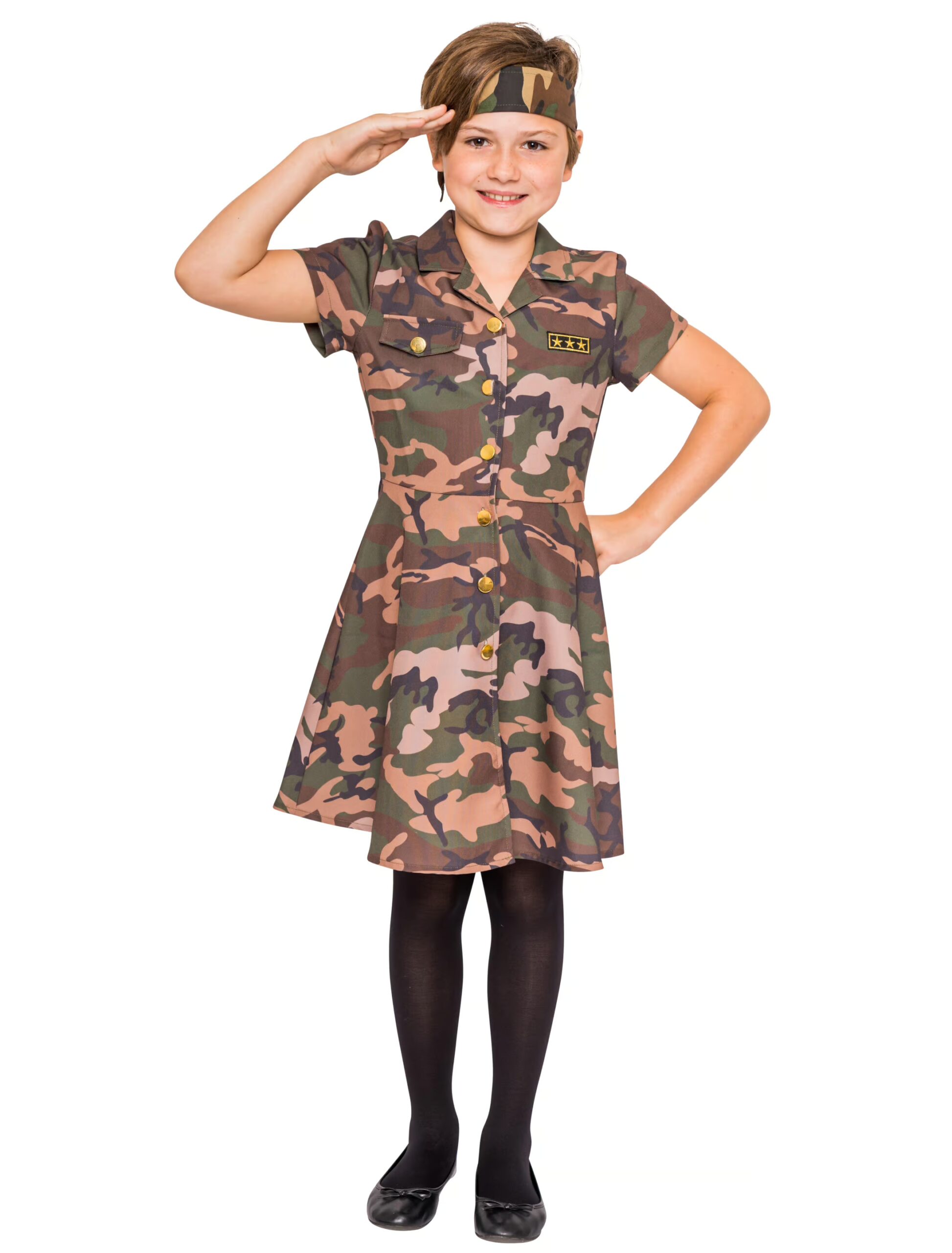 Süßes Kleid für Mädchen im gedeckten camouflage Military Look. Es ist tailliert geschnitten und wird durch eine goldene Knopfleiste geschlossen, die durch die natürlichen Grün- und Brauntönen besonders hervorstechen. Auf der rechten Brust befinden sich ein Abzeichen mit drei goldenen Sternen und auf der linken Brust eine kleine Tasche. Dadurch sieht das Kleid aus wie eine echte Uniform. Das Kleid ist in verschiedenen Größen erhältlich und ist etwa knielang. Passende Accessoires wie Stirnbänder, Mützen oder Strümpfen findest Du ebenfalls direkt bei uns im Shop.