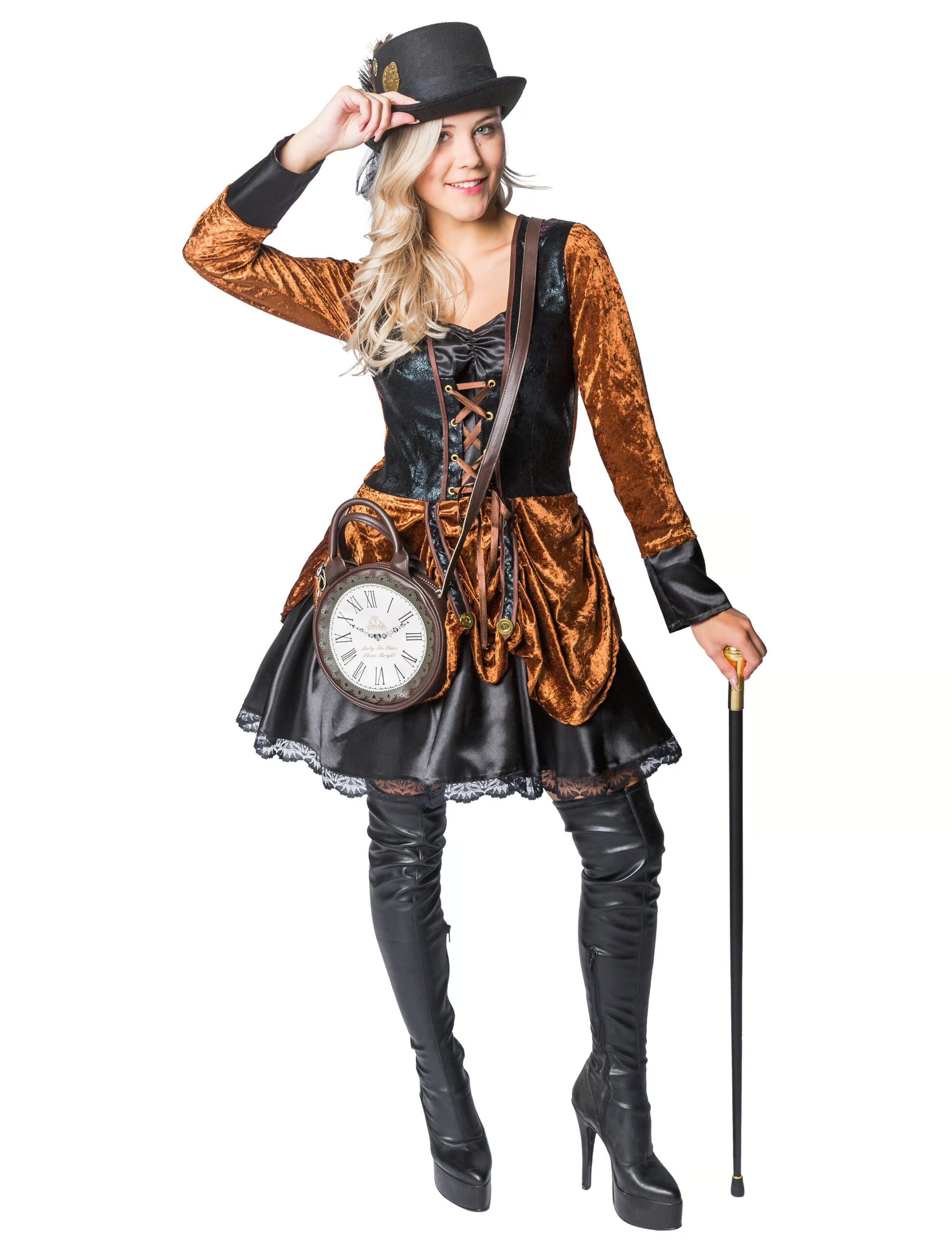 Vergangenheit trifft auf Zukunft! Der aufregende Mix aus viktorianischen und modernen Elementen macht dieses Steampunk-Kleid zu einem aufregenden Hingucker auf jeder Motto- und Karnevalsparty. Das hübsche Kleid überzeugt nicht nur durch den femininen Schnitt, der Deine Beine und Dein Dekolletee gekonnt in Szene setzt, sondern auch durch die vielen verschiedenen Stoffe und Verzierungen in Schwarz, Braun und Gold. Zu Deinem Steampunk-Kostüm passen besonders gut Fliegerbrillen, Zylinder und ausgefallener Schmuck. Exklusiv Artikel.