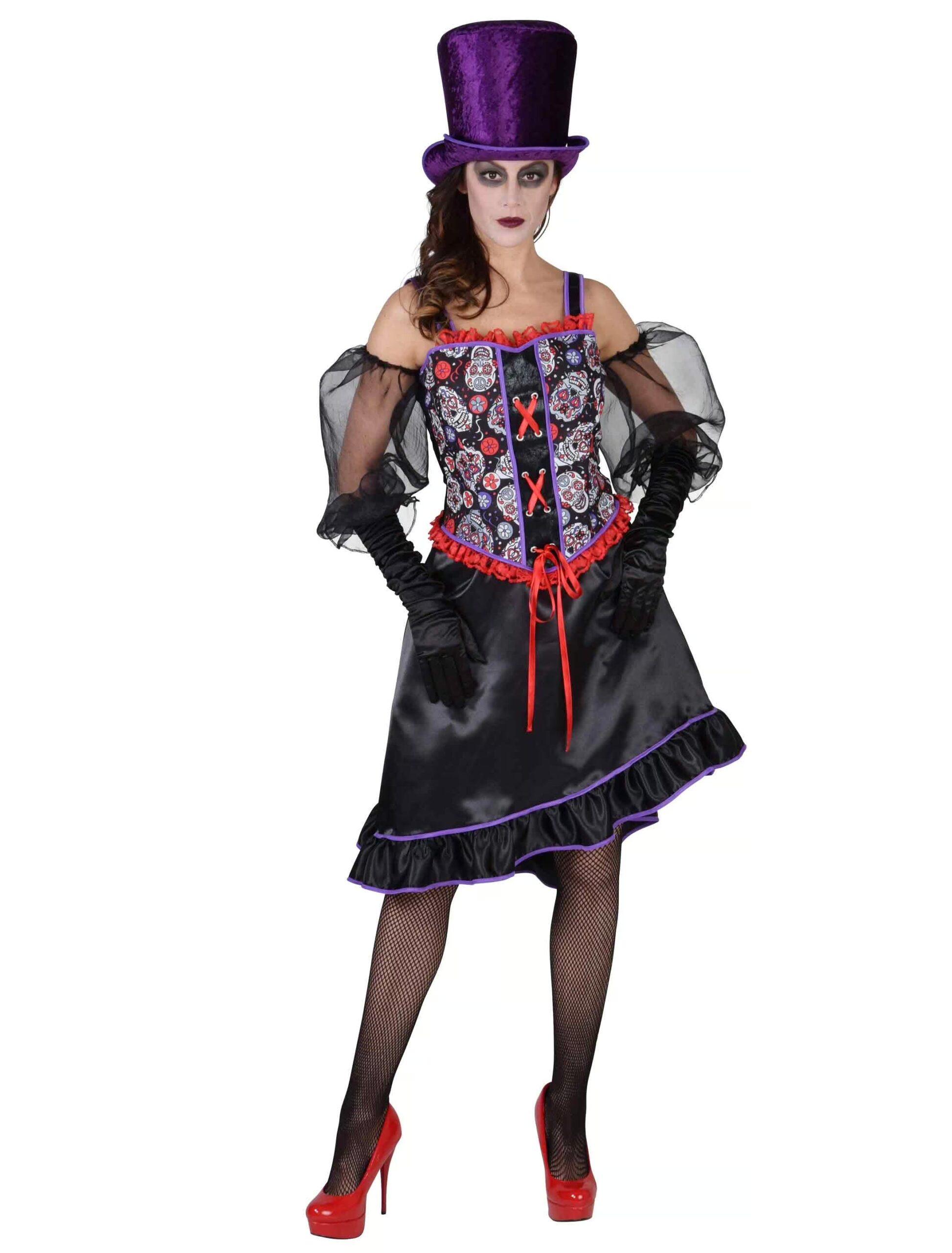 Der Tod ist erst der Anfang… auf der nächsten schaurig schönen Halloweenparty bist Du mit diesem detaillreichen Kleid ein gern gesehener und atemberaubender Gast. Enthalten ist ein einteiliges schwarzes Kleid, welches zu 100% aus Polyester besteht. Der untere Teil des Kleides ist ein schwarzer Rock. Der obere Teil des Kleides besteht aus einem Korsett und ist mit Totenköpfen in den Farben lila, rot und schwarz gemustert. Aufpeppen lässt sich das Kleid mit der dazu passenden sexy schwarzen Netzstrumpfhose und den Spitzenhandschuhen. Exklusiv Artikel.