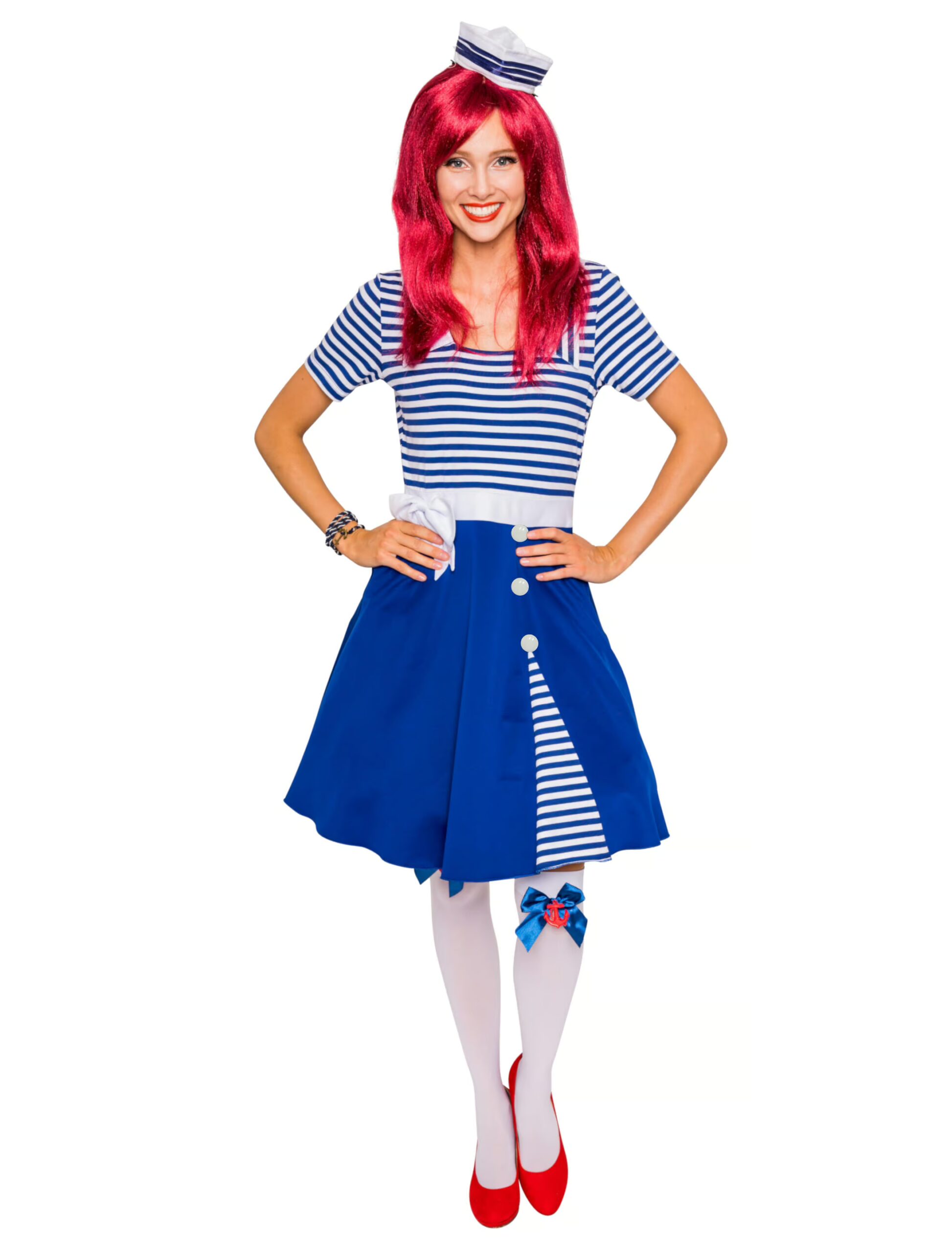 In diesem hübschen Matrosinnen Kleid in marinetypischem Blau und Weiß wirst Du zur zauberhaftesten Matrosin, die jemals auf einem Kostümfest gesehen wurde. Das aparte, figurbetonende Kleid in mädchenhaftem Look ist ein Eyecatcher und besteht aus einem ausgestellten blauen Rockteil mit quer gestreiftem, blau-weißem Einsatz, dem weißen Bund mit der seitlichen weißen Schleife und einem ebenfalls quer gestreiftem blau-weißem Oberteil mit kurzen Ärmeln, eckigem Ausschnitt und Seemannskragen. Mit diesem charmanten Kleid, einer weißen Strumpfhose und einer schicken Matrosenkappe aus unserem Shop eroberst Du zum Karneval oder Mottopartys nicht nur die sieben Weltmeere, sondern auch die Herzen der Männer!