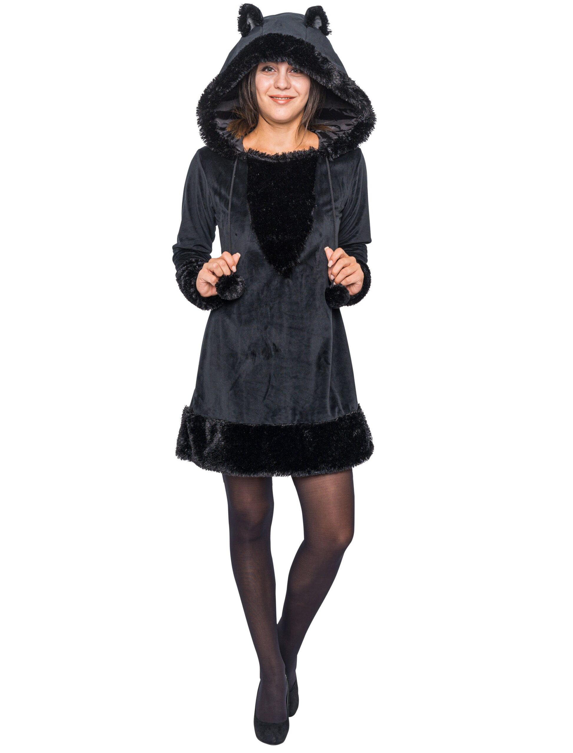 Super schick ist das schwarze Katzenkostüm, das aus Dir nicht nur den Hingucker der Motto-Party oder Faschingsfeier macht, sondern auch ein süßes, anschmiegsames Kätzchen zum Verlieben. Das hinreißende Katzenkostüm ist ein Einteiler und besteht aus einem kurzen, schwarzen Plüschkleid aus 100% Polyester mit Kapuze samt niedlichen Katzenohren und Kordelzug mit Bommeln sowie dem angenähten Katzenschwänzchen. Mit der passenden Strumpfhose und High Heels aus unserem Shop stehst Du im Mittelpunkt und bezauberst jeden, der in Deine Nähe kommt. Ob als süße Schmusekatze oder als krallenzeigender Stubentiger, für Dich wird sich diese Kostümierung lohnen und vielleicht findest Du schon auf dem nächsten Event Deinen Schmusekater.