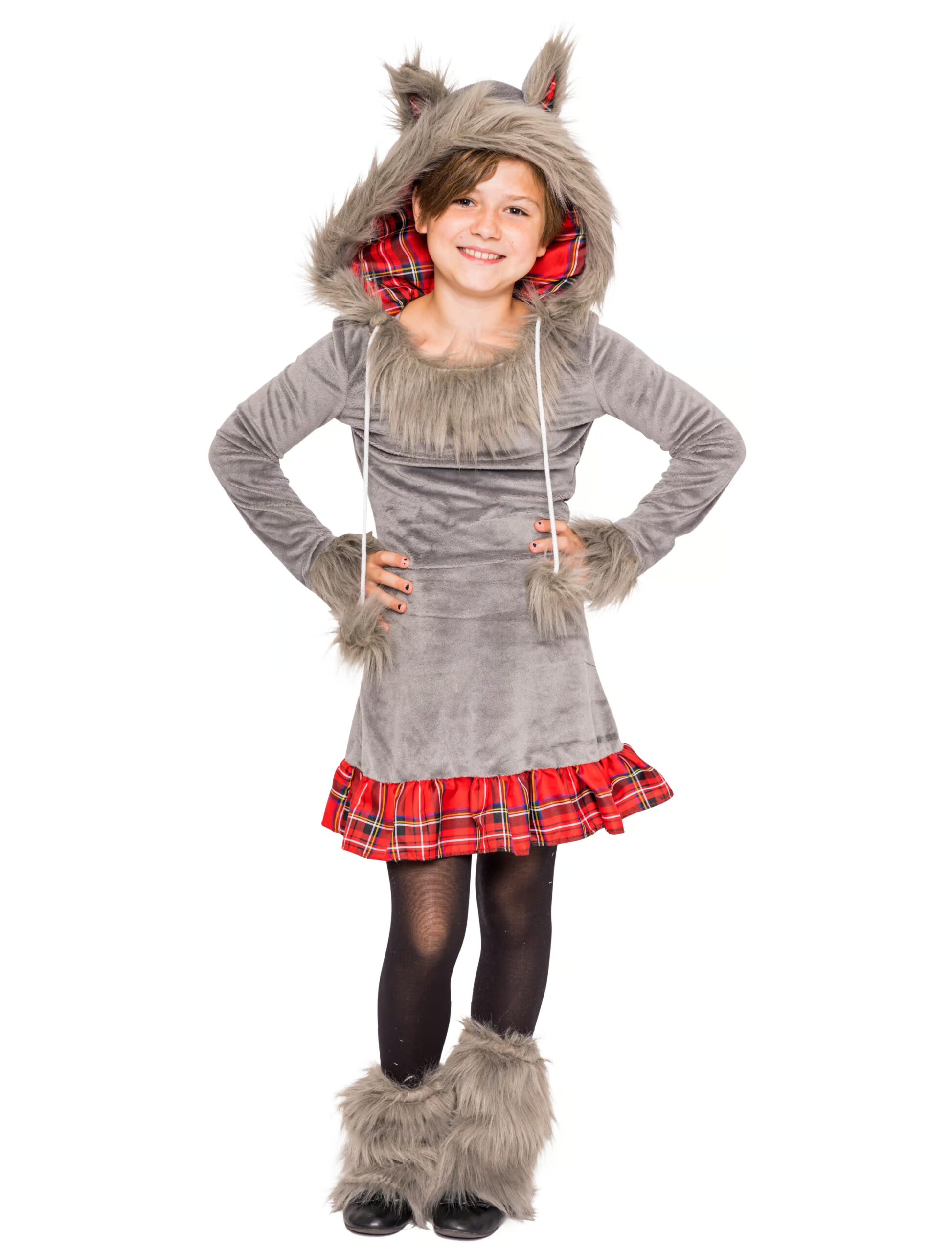Bezaubernd schön ist dieses graue Wolfskostüm aus Plüsch, das aus Deinem kleinen Racker ein allerliebstes Wolfskind macht und das zum Kindergeburtstag und zum Fasching in seinem hübschen Kostüm die Partygäste verzaubert. Das putzige Wolfskostüm besteht aus einem kurzen, grauen Plüschkleid, das am Saum mit einer rotkarierten Kante geschmückt ist sowie einer Kapuze samt Wolfsohren und Kordelzug mit Bommeln. Kapuze, Ausschnitt und Ärmel sind dekorativ mit einem Fellimitat eingefasst und der flauschige Schwanz macht das sehenswerte Kinderkostüm komplett. In diesem schicken Wolfskostüm ist Deine Kleine das lieblichste Wolfskind, das nicht nur zum Karneval viel Freude an seiner Wolfsverkleidung haben wird.