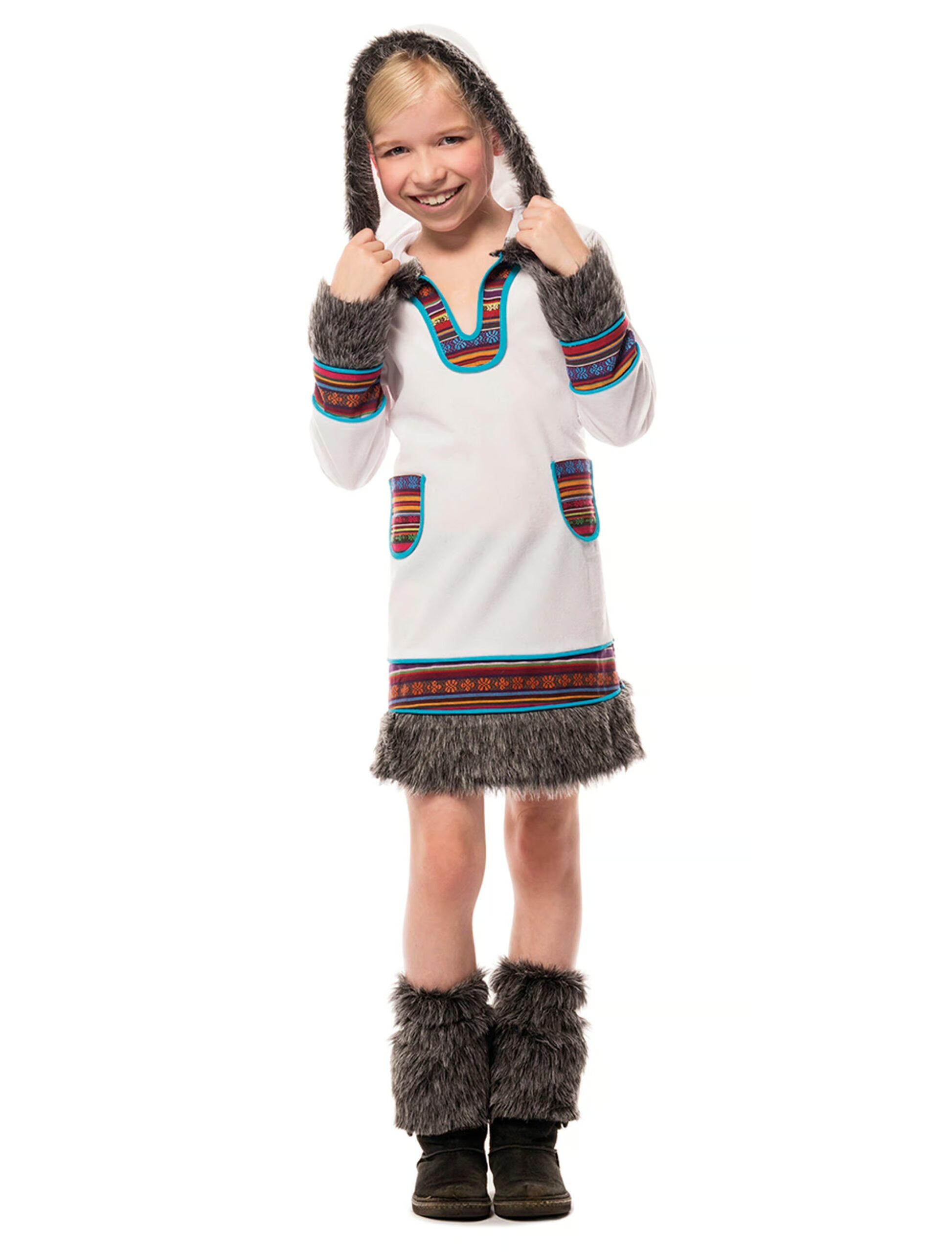 Mit dem süßen Kleid für Polar Mädchen wird es Dir auch an frostigen Tagen nicht zu kalt. Das Outfit besteht aus zwei Teilen: So kannst Du Dich über ein schickes Kleid und ein Paar Stulpen freuen. Diese halten Deine Füße beim Feiern schön warm und auch die Kapuze des Kleides schützt Dich vor kalten Winden am Nordpol. Das weiße Kleid aus Polyester hat vorne zwei kleine Taschen, in denen Du Kleinigkeiten verstauen kannst. Dazu kannst Du Schuhe aus Leder tragen und bist damit für den nächsten Schneesturm gut gewappnet. Abgerundet wird der schicke Look durch kleine bunte Details auf dem Kleid.