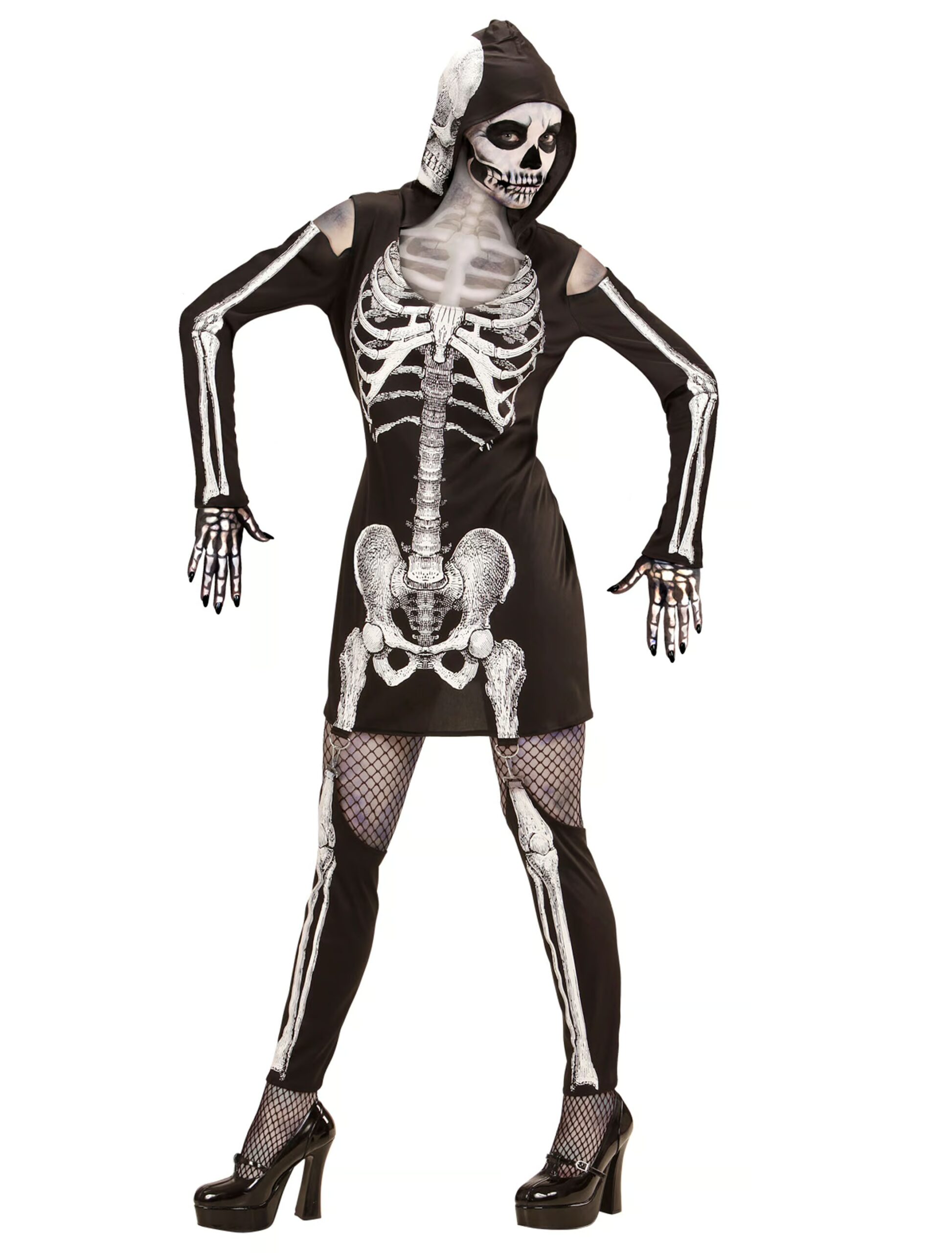 Bist Du bereit für die Nacht der Nächte? Mit dieser schaurig-schönen Verkleidung machst Du Halloween zu einem unvergesslichen Erlebnis. Das schwarze Skelettlady-Kleid überzeugt nicht nur durch den kurzen und figurbetonten Schnitt, sondern auch (und vor allem) durch die aufgedruckten Knochen, dem Brustkorb-Print und der mit einem Schädel bedruckten Totenkopf-Kapuze. Zu dem Kostüm gehören auch die passenden Stulpen, die sich am Kleid befestigen lassen. Fehlt nur noch die passende Gesichtsschminke und schon ist Deine Verkleidung für die kommende Halloweenparty perfekt.