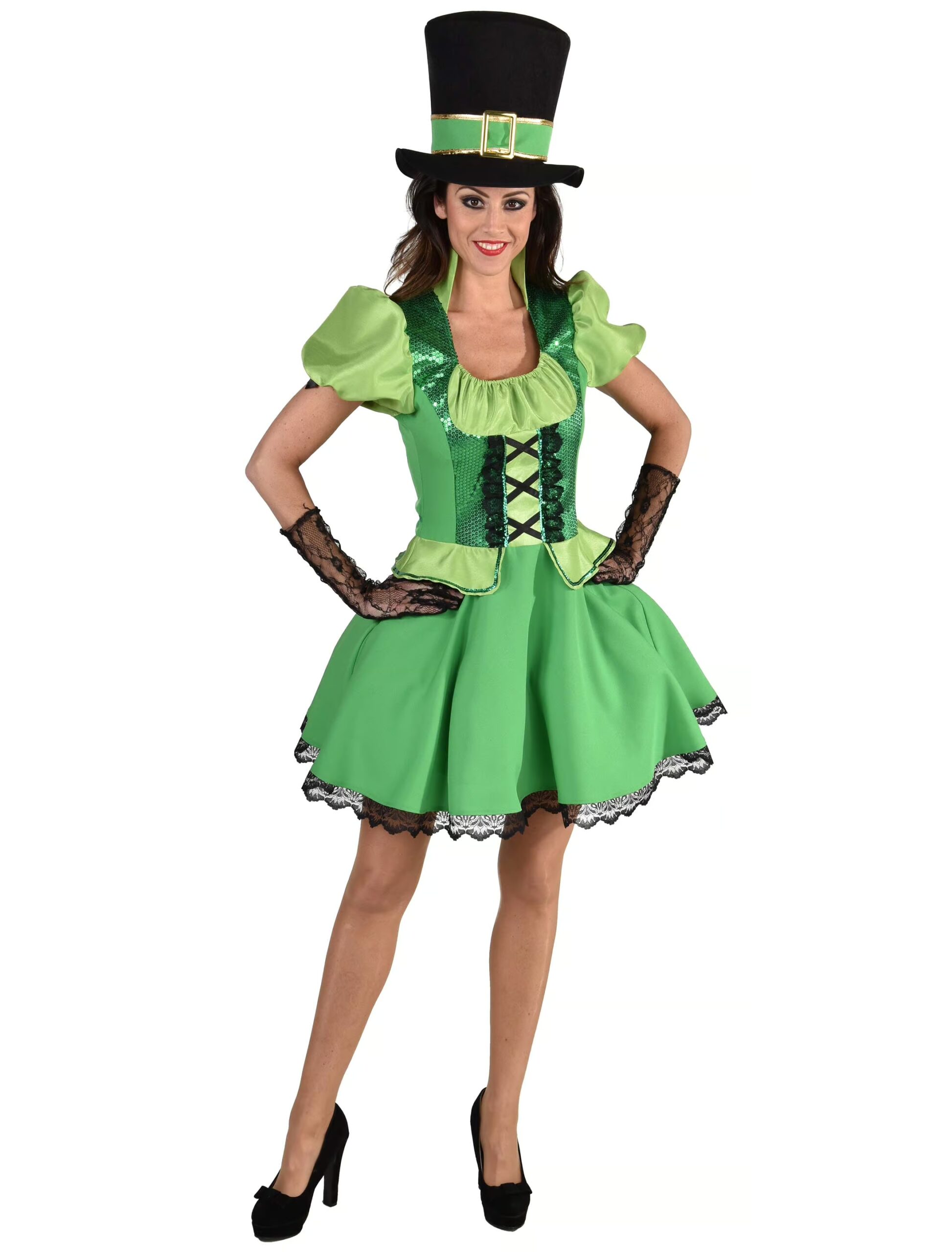 Ganz zauberhaft und so grün, wie die Wiesen Irlands, präsentiert sich das aparte kurze Kleid St. Patricks Day mit seinen vielen hübschen Details, das nicht nur dem irischen Schutzpatron St. Patrick gefallen hätte, sondern das auch auf Motto-Partys und Kostümfesten für ungeteilte Aufmerksamkeit sorgt. Das attraktive Kleid mit dem grünen, weiten, spitzen-besetzten Rock, dem hellgrünen Blusenteil mit den kurzen Puffärmeln, den Rockschößchen sowie der paillettenbestickten Weste mit schwarzer Schnürung und Spitze unterstreicht geschickt Deine Weiblichkeit, sodass Dir bewundernde Blicke sicher sind. Mit Netzhandschuhen und Zylinder aus unserem Shop wird Dein Auftritt zum St. Patricks Day und anderweitigen Kostümpartys perfekt.