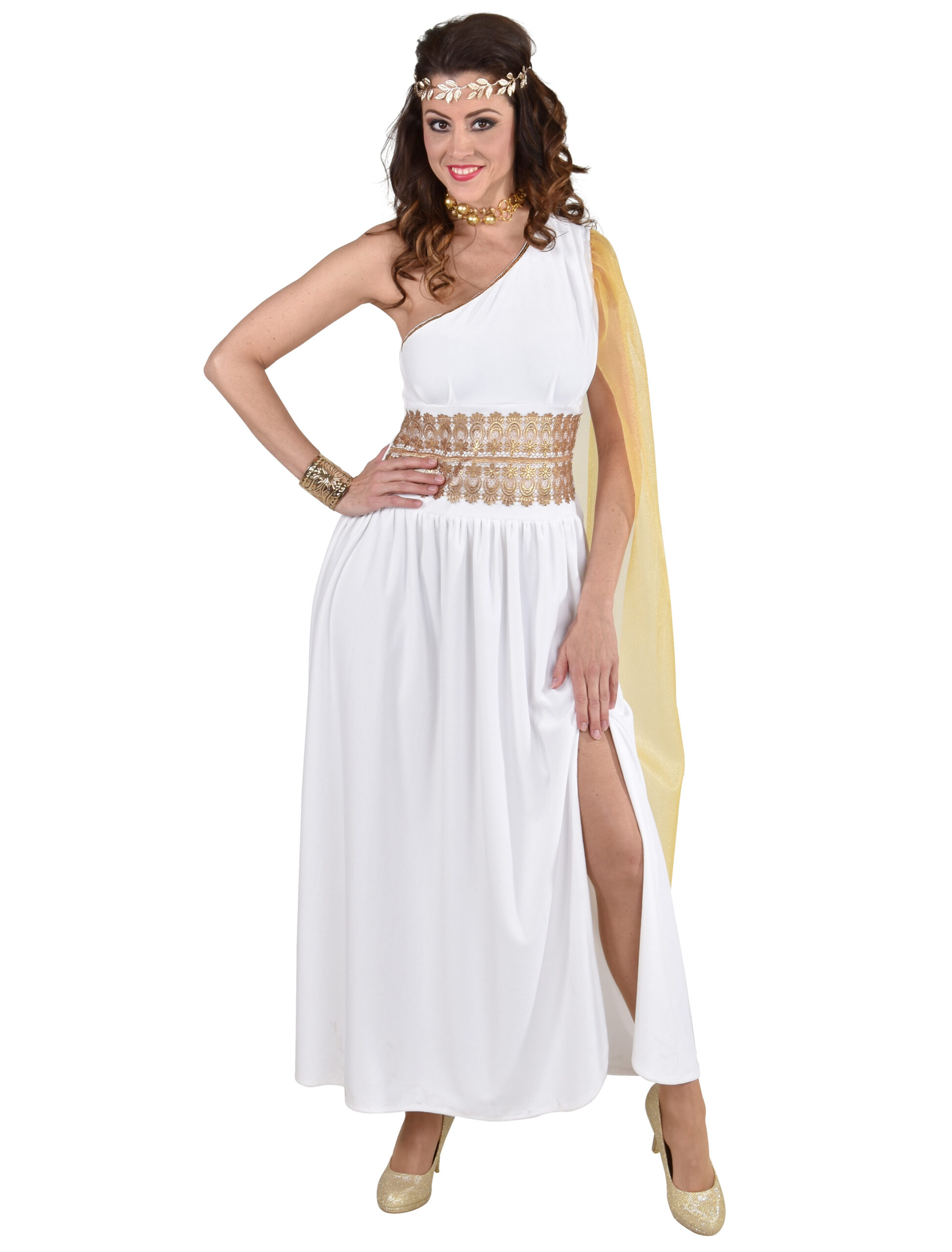 Mit diesem klassisch-eleganten Kleid verzückst Du nicht nur Sokrates, Archimedes und Pythagoras, sondern verzauberst jeden Mann auf der nächsten Kostüm- oder Karnevalsparty. Das knöchellange Kleid bezaubert durch seinen asymmetrischen Schnitt, der eine Schulter frei lässt, und den hohen Beinausschnitt. Die Goldapplikation an der Taille betont Deine Figur. Mit diesem Kleid machst Du jede Karnevals- und Mottoparty unsicher. Exklusiv Artikel.