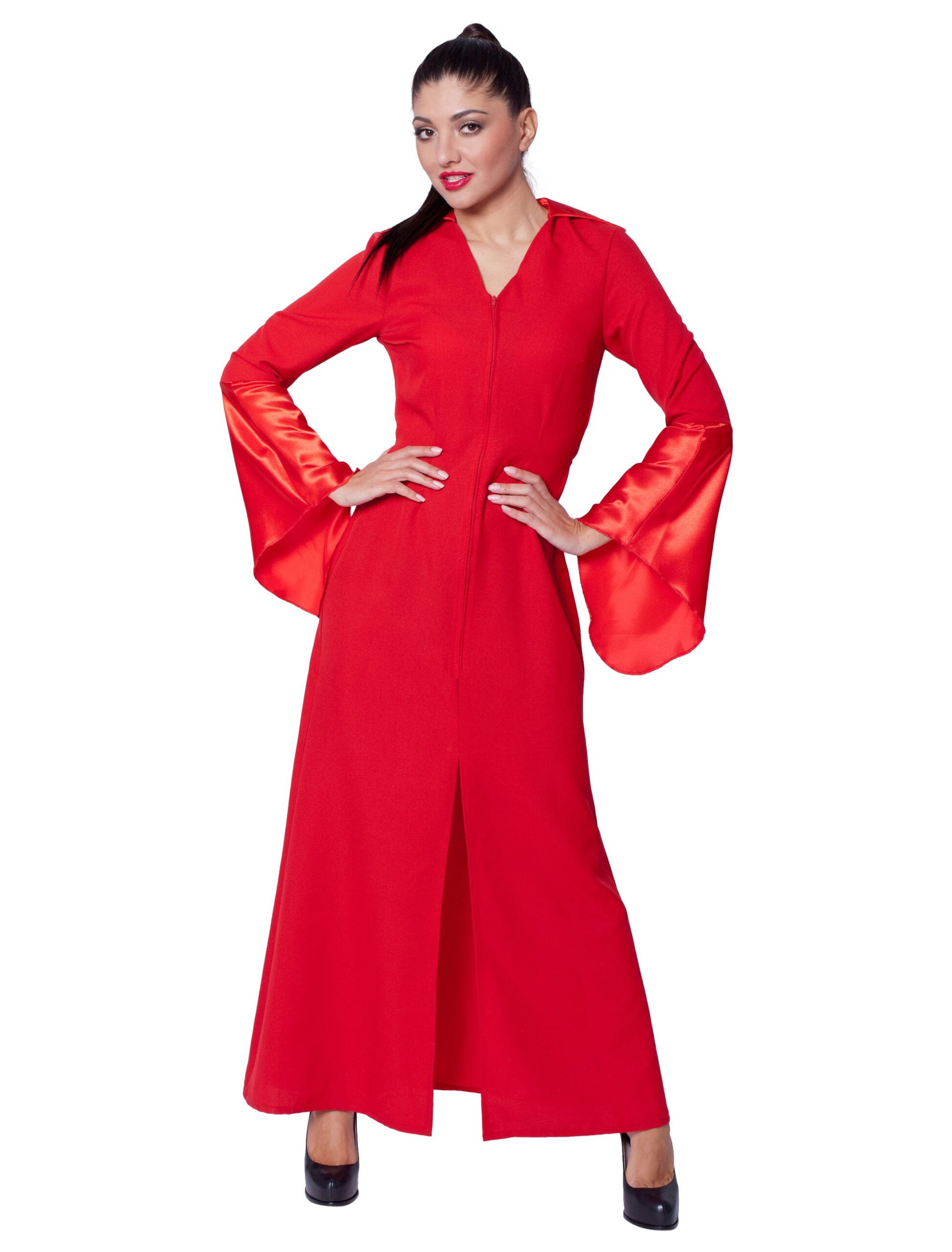 Dieses Kleid ist nicht nur schick und elegant, es überzeugt auch als wahres Kombinationswunder! Ob auf Deiner Karnevals- oder Halloweenparty – Du bist garantiert immer stilbewusst und attraktiv gekleidet! Das rote lange Kleid ist knöchellang geschnitten und mit einem praktischen Geh-Schlitz in der Front ausgestattet. Das Kleid wird im Brustbereich mit einem Reißverschluss verschlossen und lässt sich somit leicht an- und ausziehen. Besonderer Blickfang sind die eleganten und weit ausgestellten Ärmel in Satin-Optik, die Dir einen schicken Ausdruck verleihen! Ein passender weiter Kragen ebenfalls in Satin komplettiert Deinen Look! Im Rückenbereich kann das Kleid geschnürt werden und so Deiner Figur optimal angepasst werden. In diesem Kostüm bist Du, ob als Teufelin, Vampirin oder als gefürchtete Hexe der Mittelpunkt der nächsten Party!