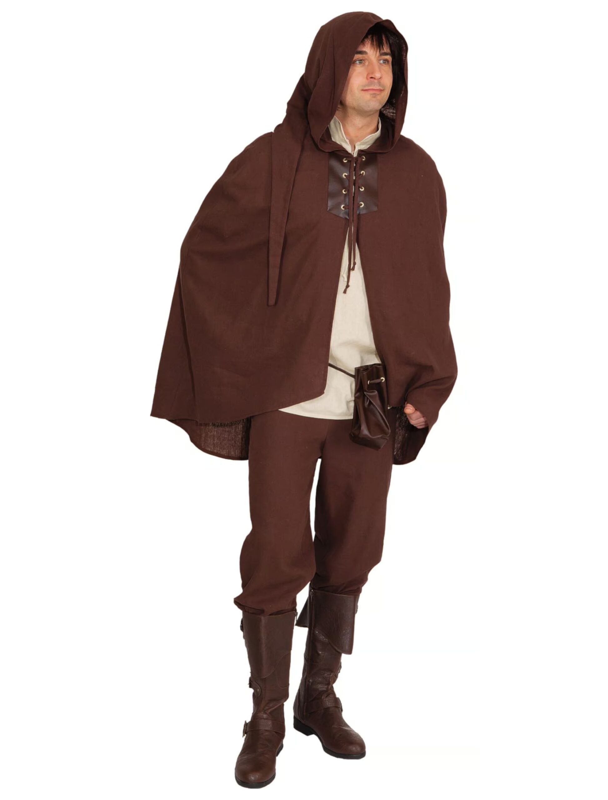 Du glaubst, Knecht sei kein begehrenswertes Dasein? Auf der nächsten Mottoparty oder dem nächsten Karnevalsumzug schon – denn in dieser Verkleidung wirst Du mit Sicherheit einige Komplimente ernten! Das dreiteilige Kostüm besteht aus Polyester und setzt sich aus einem beigen Hemd, einer Hose und einem Umhang zusammen. Der Umhang ist, genau wie die Hose, dunkelbraun und hat eine lange Kapuze und vorne eine Schnürung, welche an einem Detail aus Kunstleder befestigt ist. Dazu noch ein paar Lederstiefel und die passende Tasche und schon kannst du alles zeigen, wie cool ein Knecht sein kann!