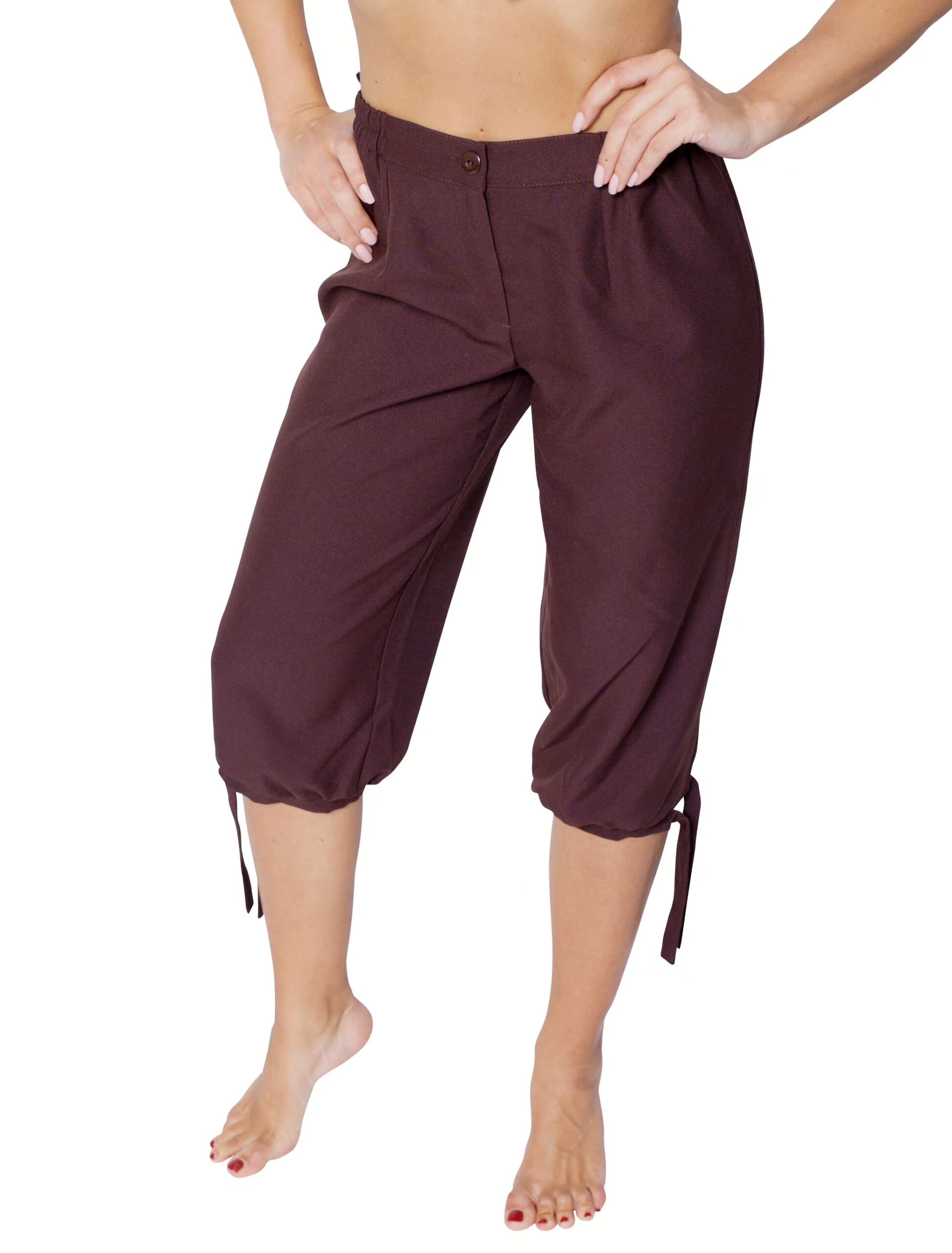 Kombinieren und einen individuellen Look kreieren! Dir gefallen bereits zusammengestellte Kostüme nicht? Das macht nichts, denn mit dieser Kniebundhose kreierst du im Handumdrehen deinen individuellen Look. Die Kniebundhose ist aus einem braunen Stoff gefertigt, der sehr leicht ist und sich dadurch angenehm tragen lässt. Durch den eingearbeiteten Gummizug passt sich die Hose individuell deiner Figur an und zwickt nicht. An den Knien läuft die Hose enger zusammen und schließt jeweils mit zwei seitlichen, braunen Bändern ab, die sich knoten lassen. Ob als Piratin, Seeräuberin oder Banditin, in Kombination mit den passenden Kleidungsstücken und Accessoires wie einer Rüschenbluse, einem Mantel oder einem Schwert stellst du dir ganz einfach dein individuelles Kostüm zusammen und bist einmalig und unverwechselbar auf jeder Karnevalsparty! Material: 100% Polyester