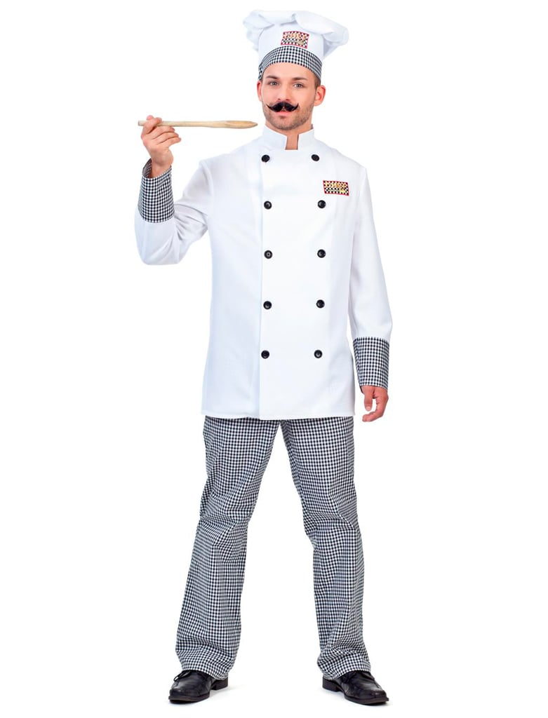 Unser Kochkostüm ist dreiteilig, bestehend aus einer Jacke, einer Hose und einer Mütze. Die Jacke ist aus einem weißen Stoff gefertigt und wird in der Front von zwei schwarzen Knopfleisten geschmückt. Die Ärmelabschlüsse sind mit einem schwarz weiß kariertem Stoff abgesetzt. Dieser schwarz-weiß karierte Stoff findet sich bei der Hose als auch an der dazugehörigen Kochmütze wieder.