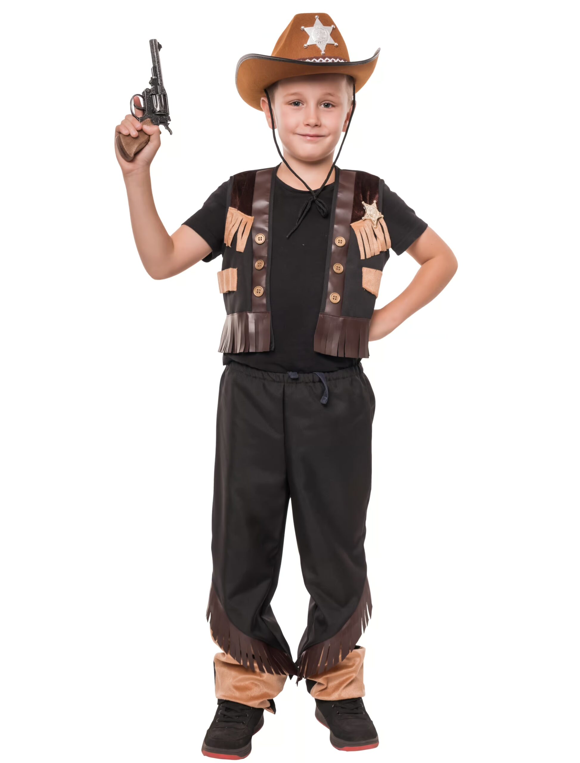 Howdy, kleiner Cowboy! Mit unserem zweiteiligen Kostüm bestehend aus einer Weste und einer Hose wirst du zum Helden jeder Wildwest-Party. Die Weste ist ein echter Hingucker: Sie ist mit Fransen, dekorativen Knöpfen und einem glänzenden Sheriff-Stern verziert – so sieht jeder sofort, wer hier das Sagen hat! Die passende Hose ist schlicht gehalten, bietet aber durch den elastischen Bund jede Menge Bewegungsfreiheit – perfekt für mutige Duelle an Karneval, Fasching oder beim Kindergeburtstag!