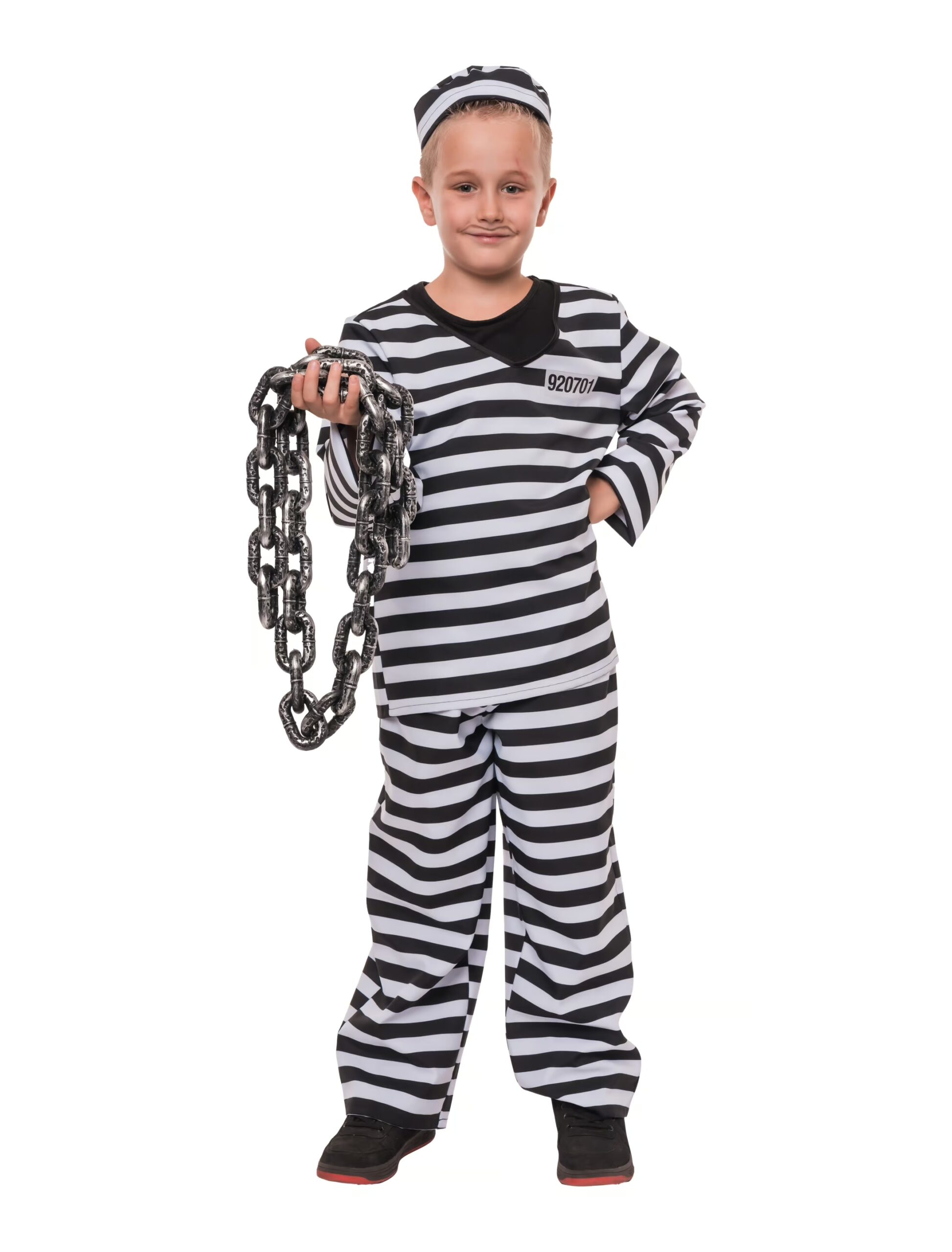 Unser Kostüm Sträfling für Kinder sorgt für jede Menge Spielspaß im „Gefängnis-Style“. Das dreiteilige Set besteht aus Oberteil, Hose und passender Mütze – alles farblich perfekt aufeinander abgestimmt. Das Oberteil wird im Nacken mit einem Knopf geschlossen und trägt die typische Sträflingsnummer 920701. Die Hose hat einen elastischen Bund, der für angenehmen Tragekomfort sorgt. Ob Karneval, Kindergeburtstag oder Theateraufführung – mit unserem Kinder Sträflingskostüm geht’s direkt hinter die „Gitterstäbe“, aber garantiert nur zum Spaß!