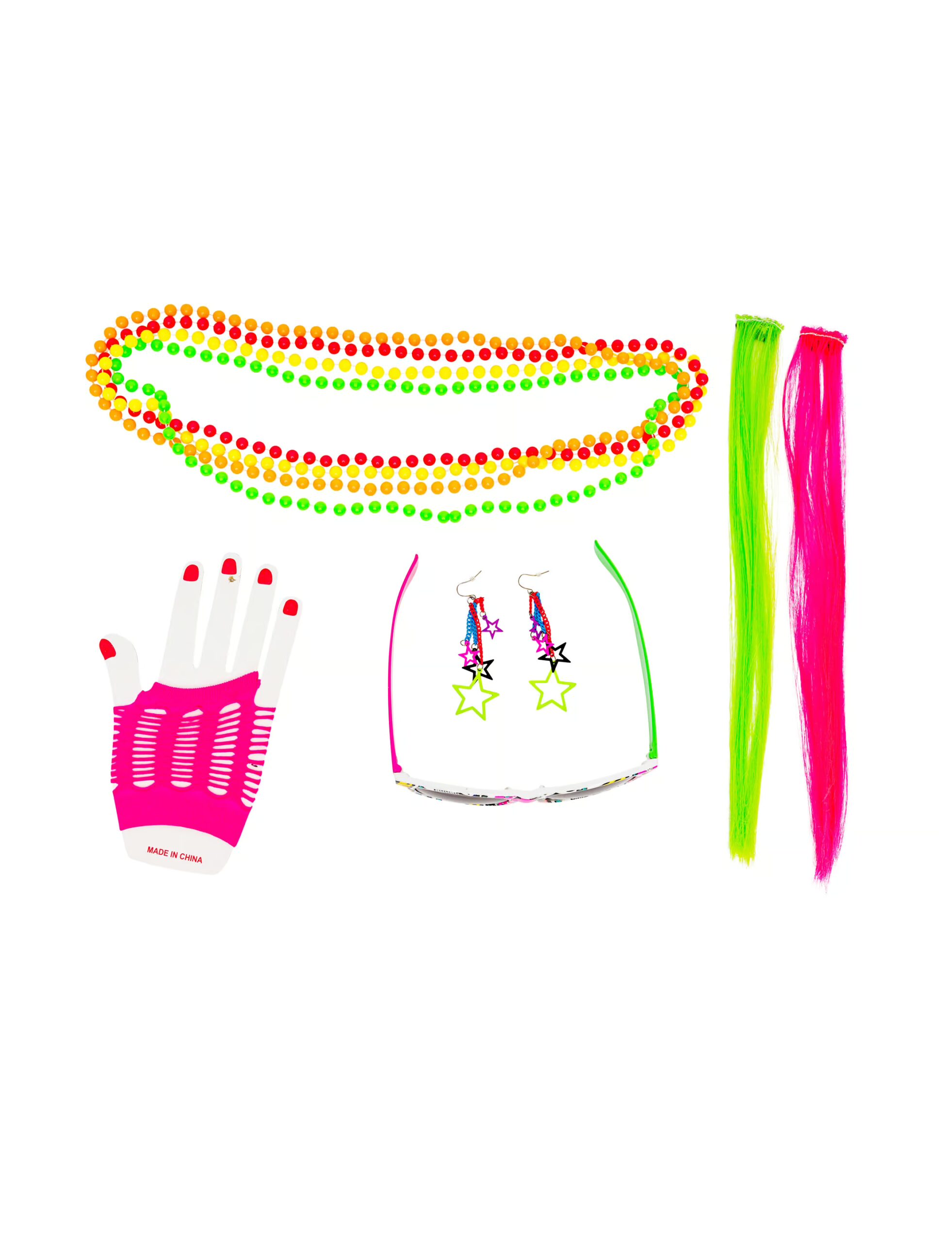 Dieses leuchtende Set in Neonfarben ist Dein idealer Begleiter, um im nächsten Karneval für den passenden 80’s Vibe zu sorgen. Das Set ist farblich perfekt aufeinander abgestimmt und besteht aus einer Halskette mit Perlen (ca. 80cm lang), bunten Strähnen für die Haare (ca. 38cm lang), einem Paar Ohrringe (ca. 7,5cm lang), Handschuhen und einer Sonnenbrille. Mit diesen knalligen Accessoires ist der Spaß garantiert!