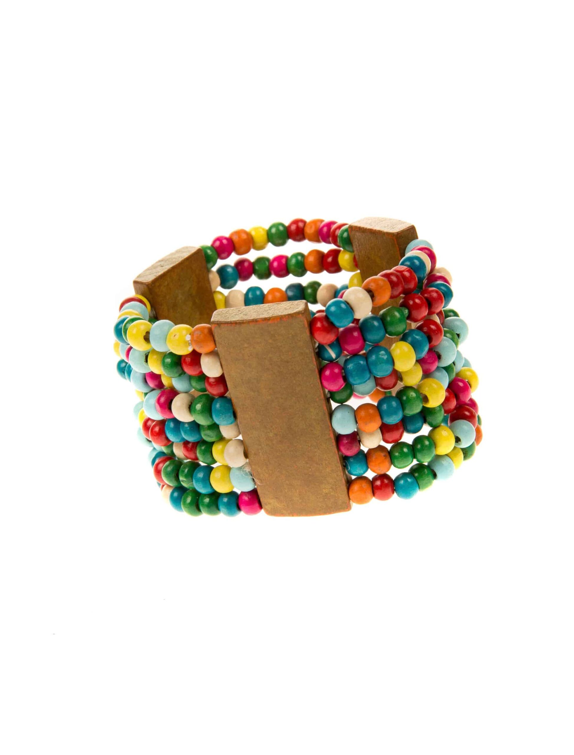 Wunderschönes Holzarmband, welches reihenweise abwechselnd mit bunten Holzperlen verziert ist. Zusammengehalten wird der hübsche Armschmuck durch drei schwarze Holzelemente. Ein tolles Accessoire für alle Indianer- und Pocahontas-Kostüme!