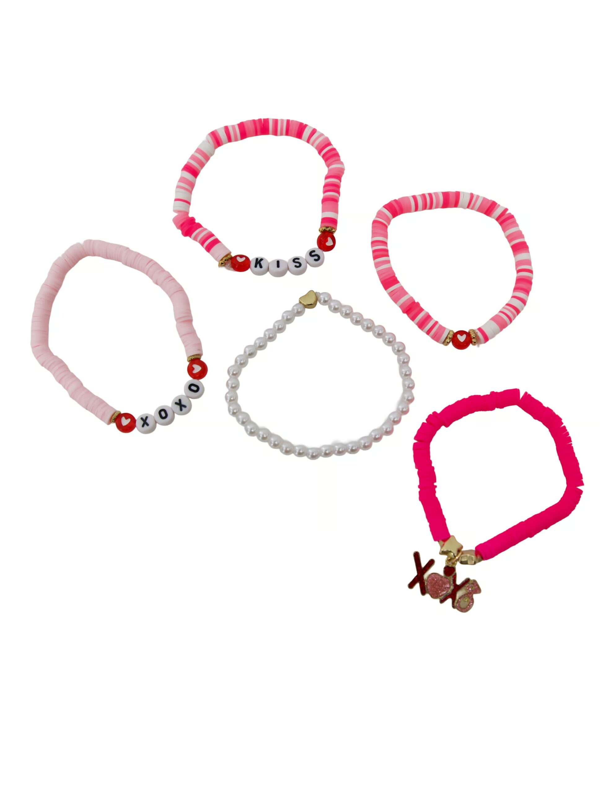 Unser Armbandset Perlen XOXO ist die perfekte Kombination aus Style und Botschaft. Im Set findest du fünf verschiedene Armbänder, die farblich harmonisch aufeinander abgestimmt sind. Ein Armband trägt den Schriftzug „XOXO“, ein weiteres den Schriftzug „KISS“, dazu kommt ein Armband mit einem kleinen „XOXO“-Anhänger. Die übrigen Bänder runden das Set optisch ab und sorgen für ein stimmiges Gesamtbild. Ob als süßes Detail zum Alltagslook, als Geschenk für besondere Anlässe oder als Highlight auf jeder Party!