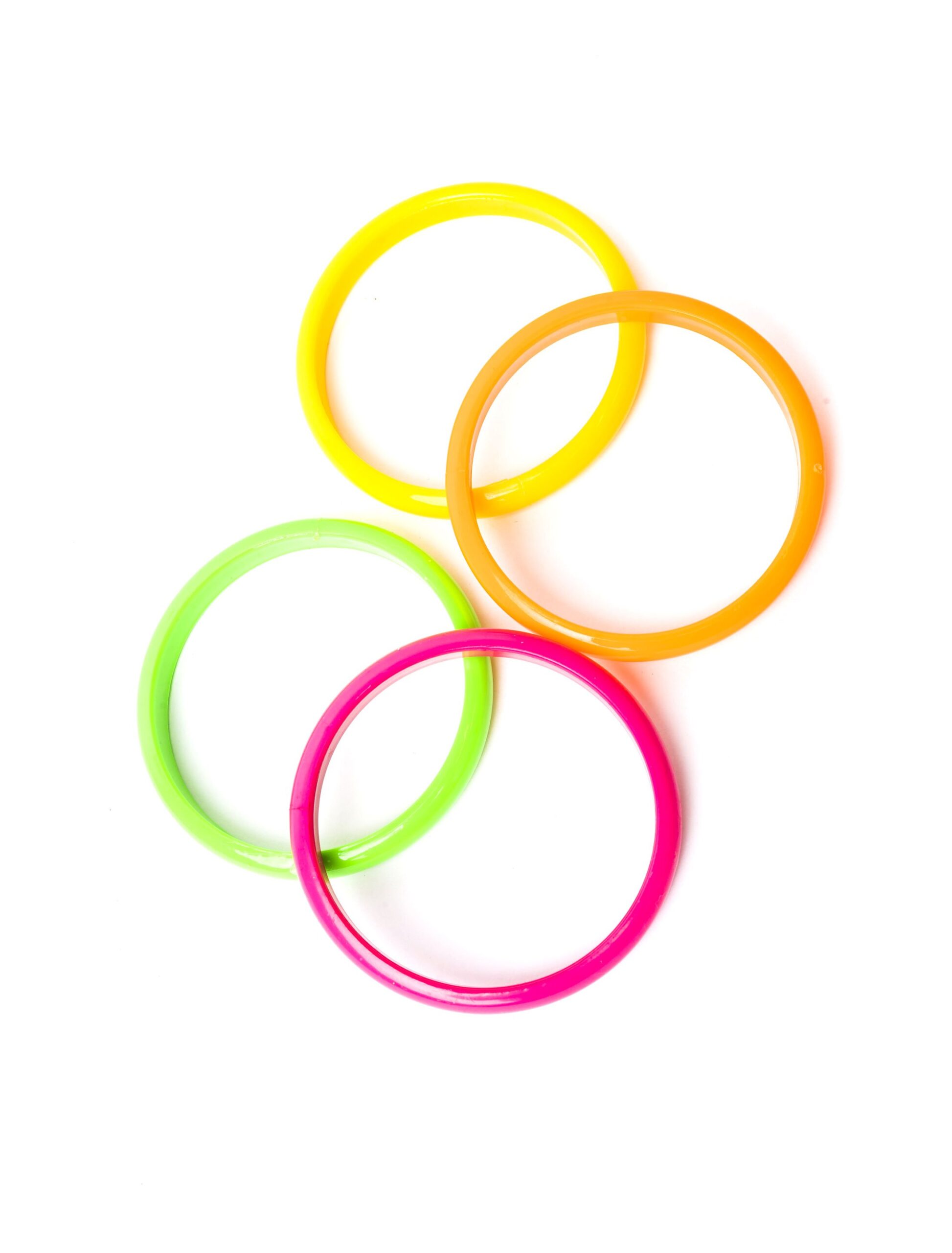 Schrille Armreifen, die auf keiner (80er-Jahre) Mottoparty fehlen dürfen! Jetzt wird es grell: Dieses vierteilige Set, bestehend aus einem neongrünen, neonpinken, neongelben und neongelben Armband rundet jedes farbenfrohe Hippie-, Disco- oder 80er-Jahre-Kostüm gekonnt ab. Dazu passen auch Haarbänder, neonfarbene Strumpfhosen und weitere farbenfrohe Accessoires.