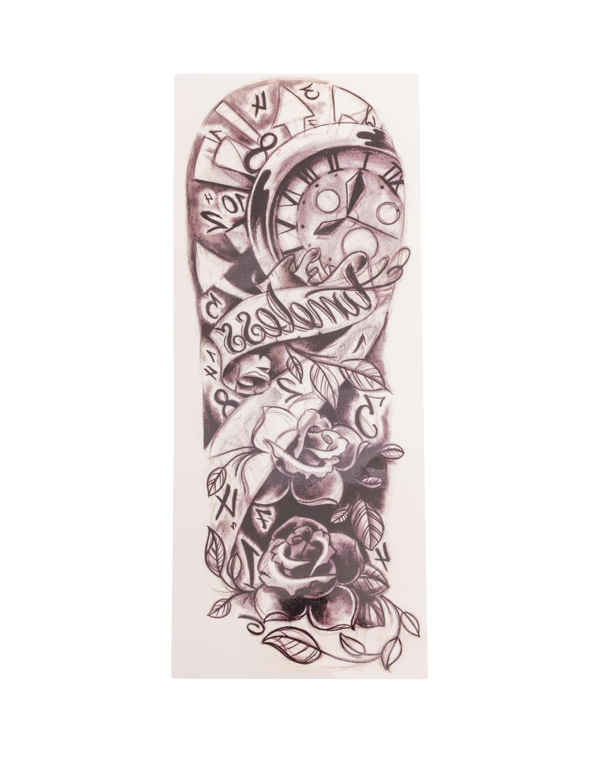 Täuschend echt! Dieses Tattoo kannst Du bequem und schnell auf Deinen Arm anbringen und Deine Freunde überraschen. Das hübsche, schwarz-weiße Tattoo, das aus einer Uhr, Ziffern, Rosen und der Aufschrift timeless†besteht, passt besonders gut zu Rock ‘n’ Roll- oder Rockabilly-Kostümen und fällt durch seinen schönen Look schon aus der Ferne auf.