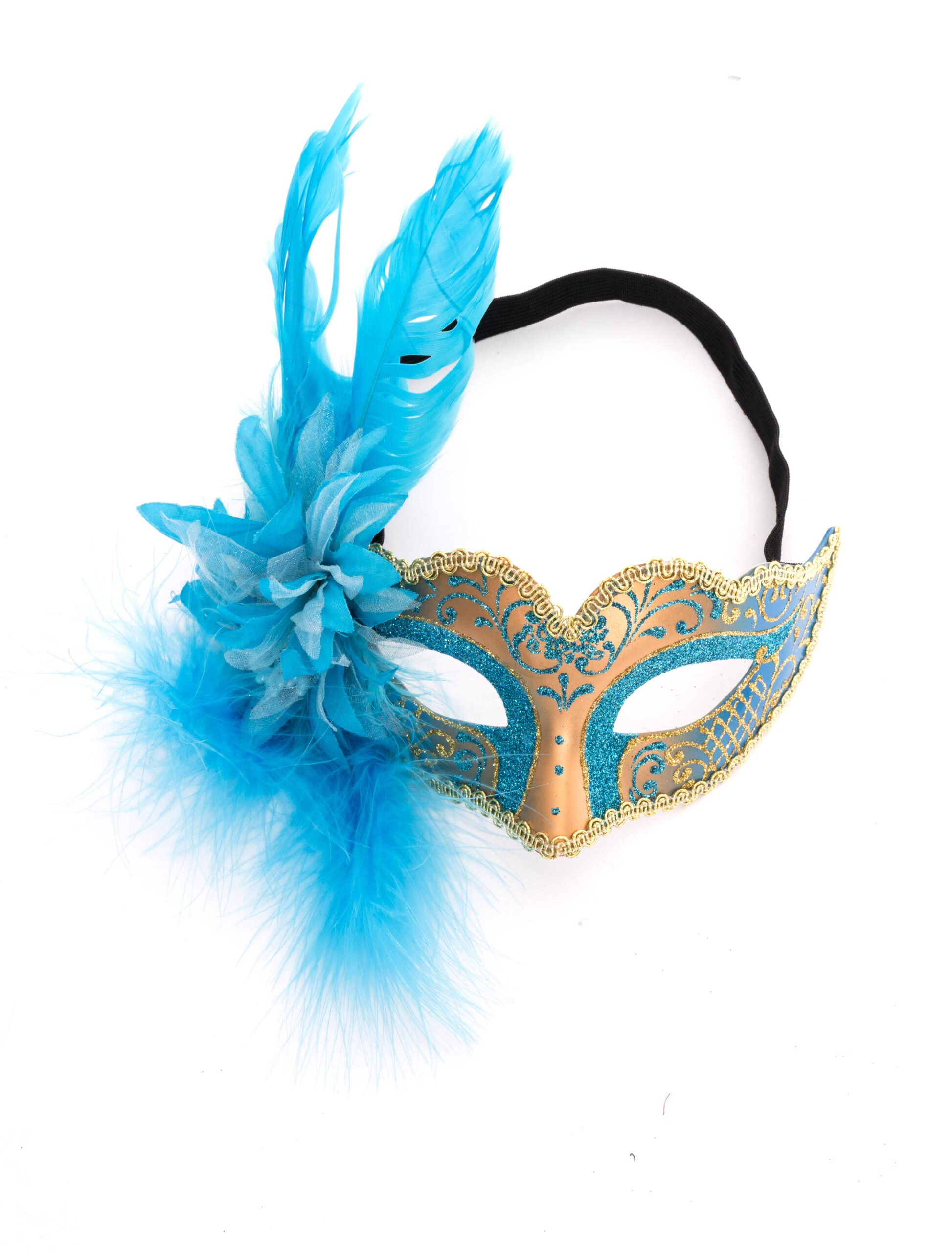 Du bist auf der Suche nach einer passenden Maske für Dein venezianisches Outfit? Diese gold-türkisfarbene Augenmaske mit Blume und Feder macht Dein Kostüm komplett. Sie ist mit goldenem und türkisfarbenem Glitzer verziert und wird zusätzlich mit einer Blume in Türkis geschmückt. Die Maske ist mit einem Gummiband ausgestattet. Eine wunderschöne Maske zu Deinem venezianischen Kostüm beim nächsten Maskenball!