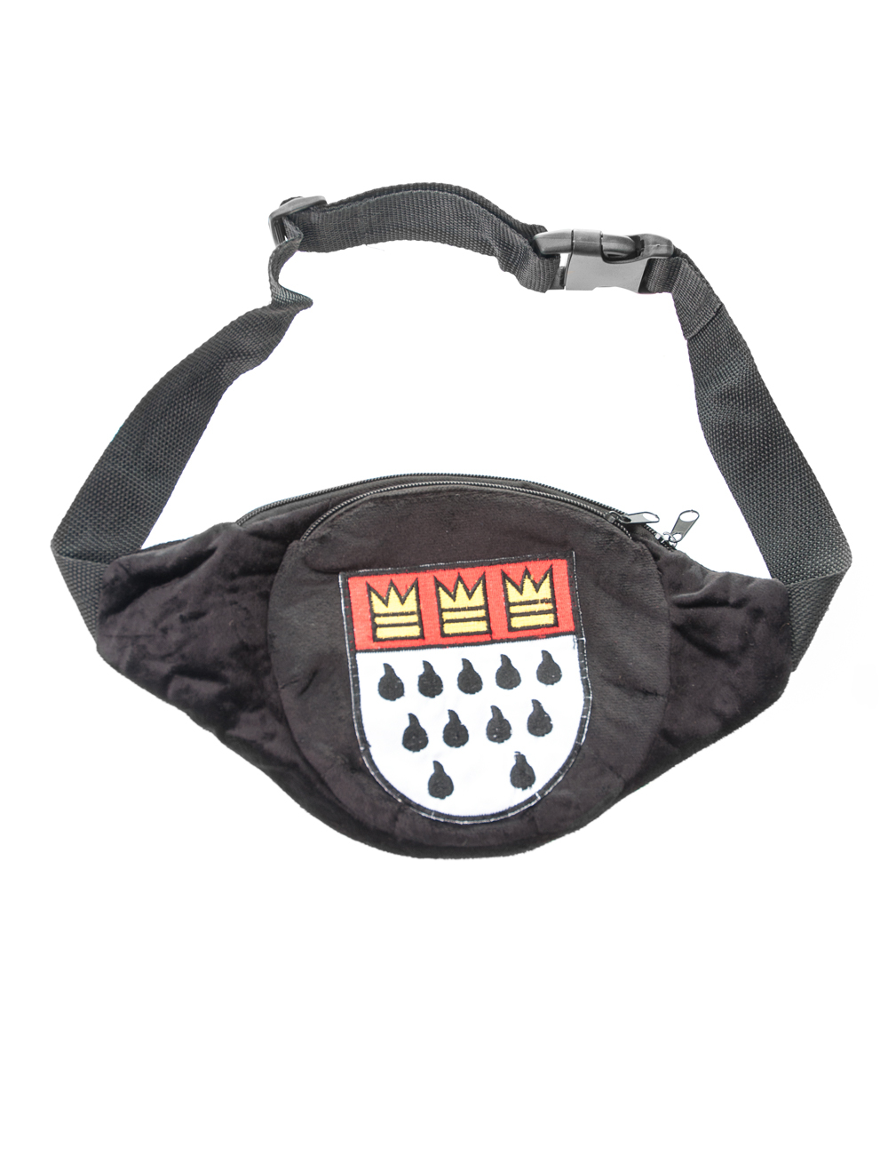Wohin nur mit dem Handy beim Karnevalsumzug? Dein Kostüm hat auch keine Taschen? Dann brauchst Du die ovale Bauchtasche mit Kölner Wappen aus schwarzem Plüsch. Hier kannst Du alles, was Du dringend brauchst verstauen und bist vor Diebstahl einigermaßen sicher. So kannst Du die schönste Zeit des Jahres ungestört genießen, ohne Dir Sorgen um Deine Habseligkeiten zu machen. Die ovale Bauchtasche mit Kölner Wappen aus Plüsch in Schwarz lässt sich ganz einfach umschnallen und ist so praktisch für jeden Karnevalsumzug.