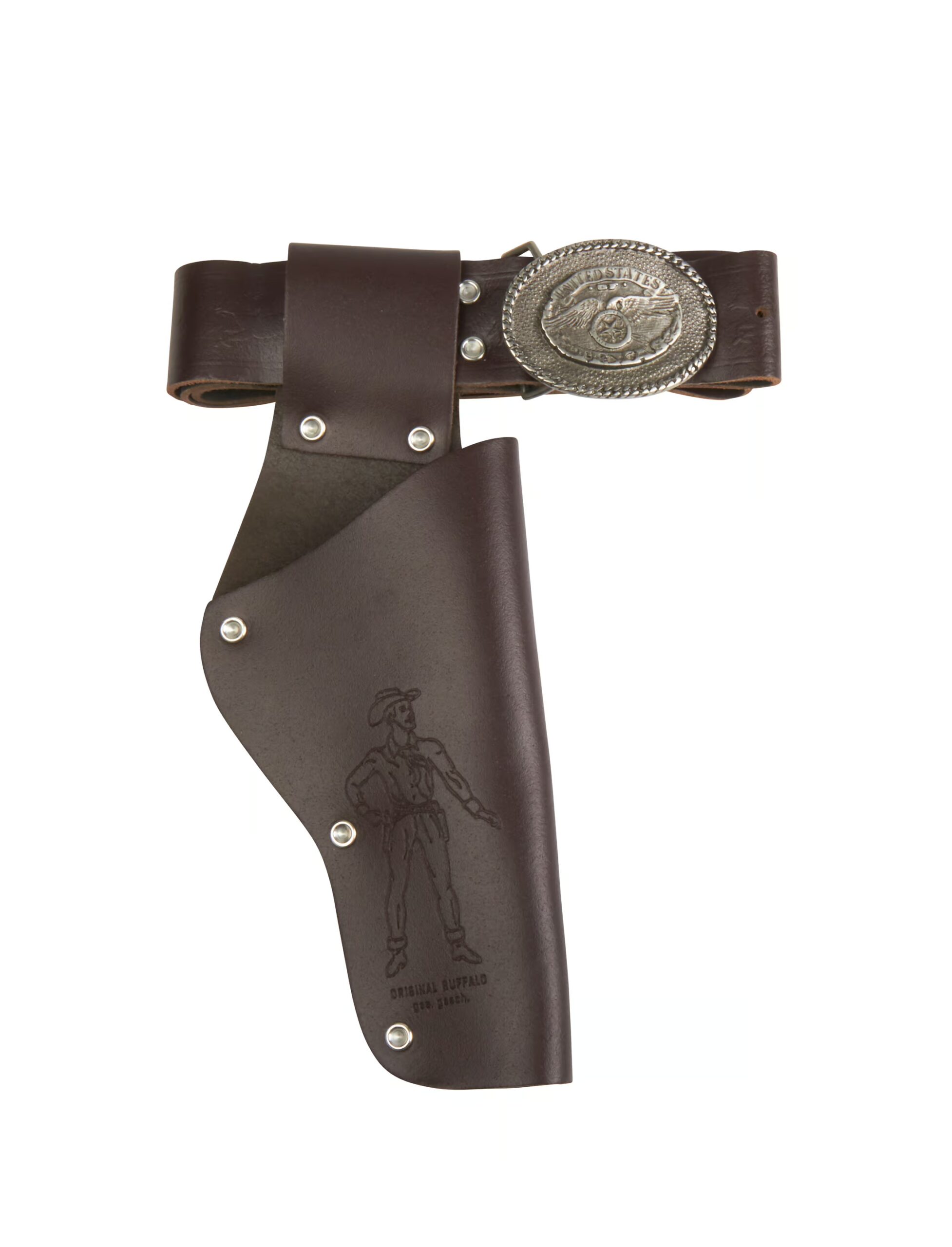 Perfekt für alle Revolverhelden unter Euch: unser Pistolengürtel mit einer Holstertasche in Braun! Der Holster ist dezent mit einer Cowboy-Gravur und Nieten verziert. Der Gürtel wird mit einer detailreichen Schnalle aus Metall gehalten. Beide Teile sind aus 100% Leder gefertigt. Wenn’s drauf ankommt, ziehst Du damit Deinen Revolver schneller als Dein eigener Schatten!
