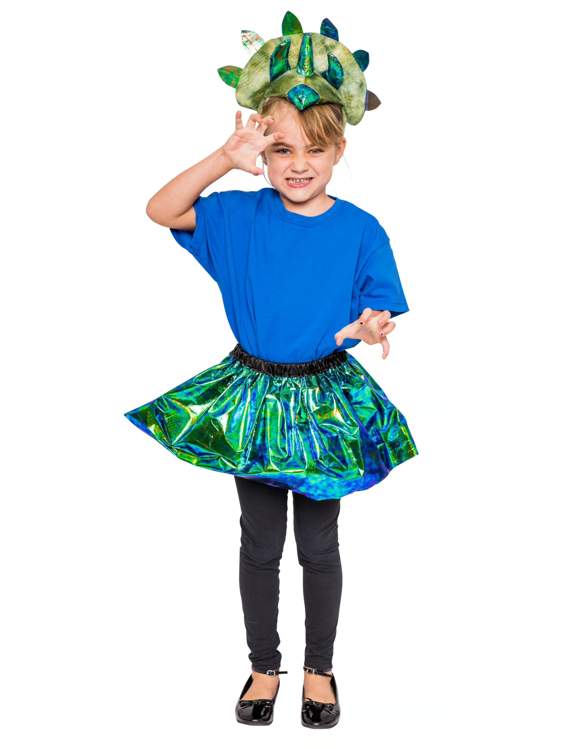 Mit dem metallic grünen, zweiteiligen Dinosaurier-Set wird aus Deinem Kind in Windeseile, das schönste und süßeste Dinosaurierkind auf der Welt. Das Set besteht aus aus einem metallic grünen Rock mit elastischen, schwarzen Gummibund und einem coolen Haarreif mit den typischen Dinosaurierhörnern. Mit dem richtigen KostümZubehör aus unserem Shop ist Dein Kind super schnell verkleidet. Das niedliche Dinokostüm ist nicht nur eine tolle Verkleidung im Fasching und Karneval, sondern auch bestens geeignet für einen angesagten Dino-Kindergeburtstag.