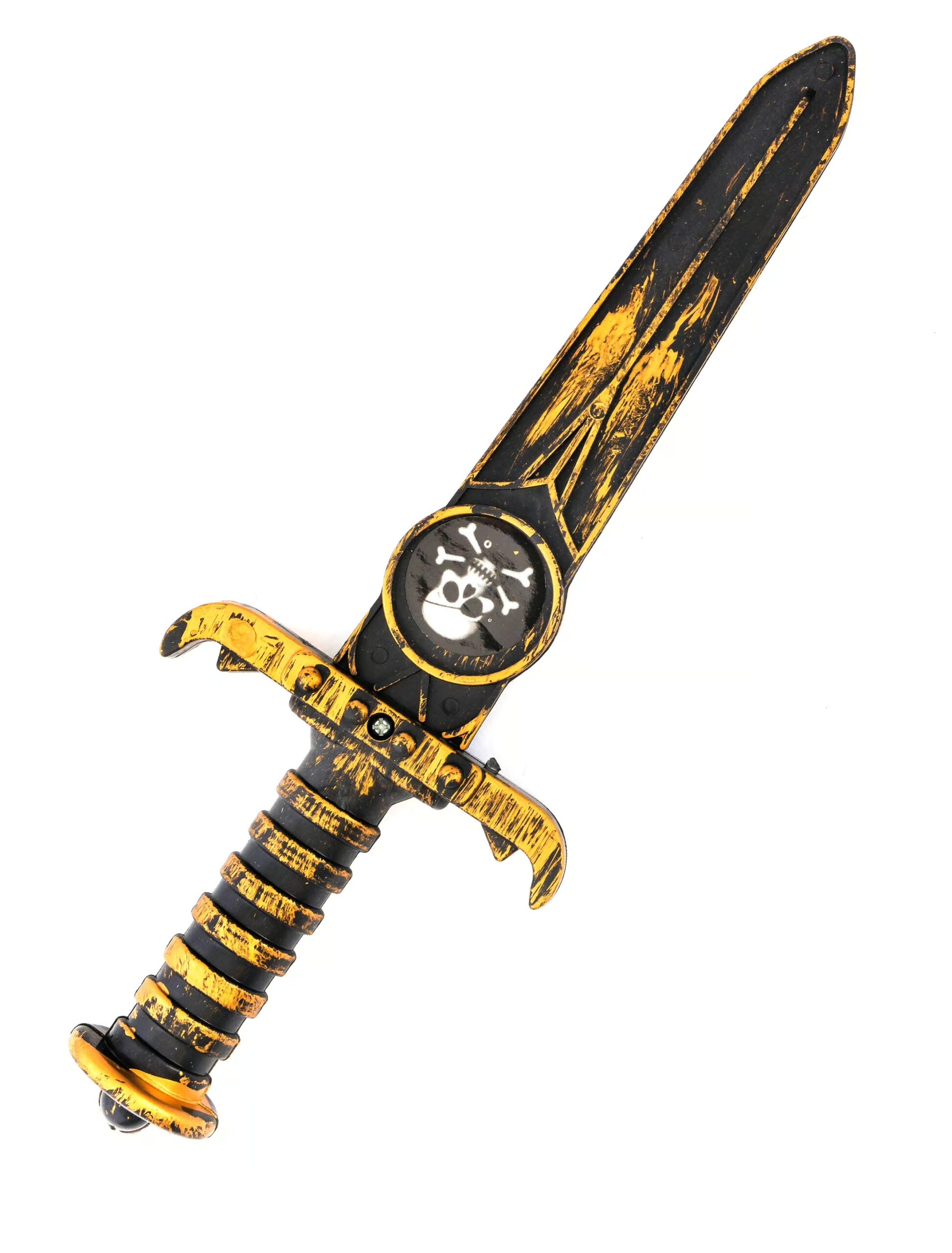 Ein Dolch gehört zu der Grundausstattung jedes Räubers, Piraten oder Dämonenjägers. Durch den integrierten Totenkopf eignet sich der besonders für alle Halloweenfans, denn er verleiht der Waffe einen düsteren und grauenerregenden Eindruck. Auch als Accessoire zu einem Karnevalkostüm bist Du mit diesem 22,5 cm langen Dolch jederzeit passend ausgestattet. Die goldene, schwarze Farbe des Kunststoffschwertes mit Totenkopfverzierung imitiert sehr gut den vom vielen Gebrauch und in die Jahre gekommenen, rostigen Stahl eines Langmessers. Noch dazu gestalten die aufwendigen Verzierungen der Dolch noch authentischer und geben ihm einen edlen Touch.