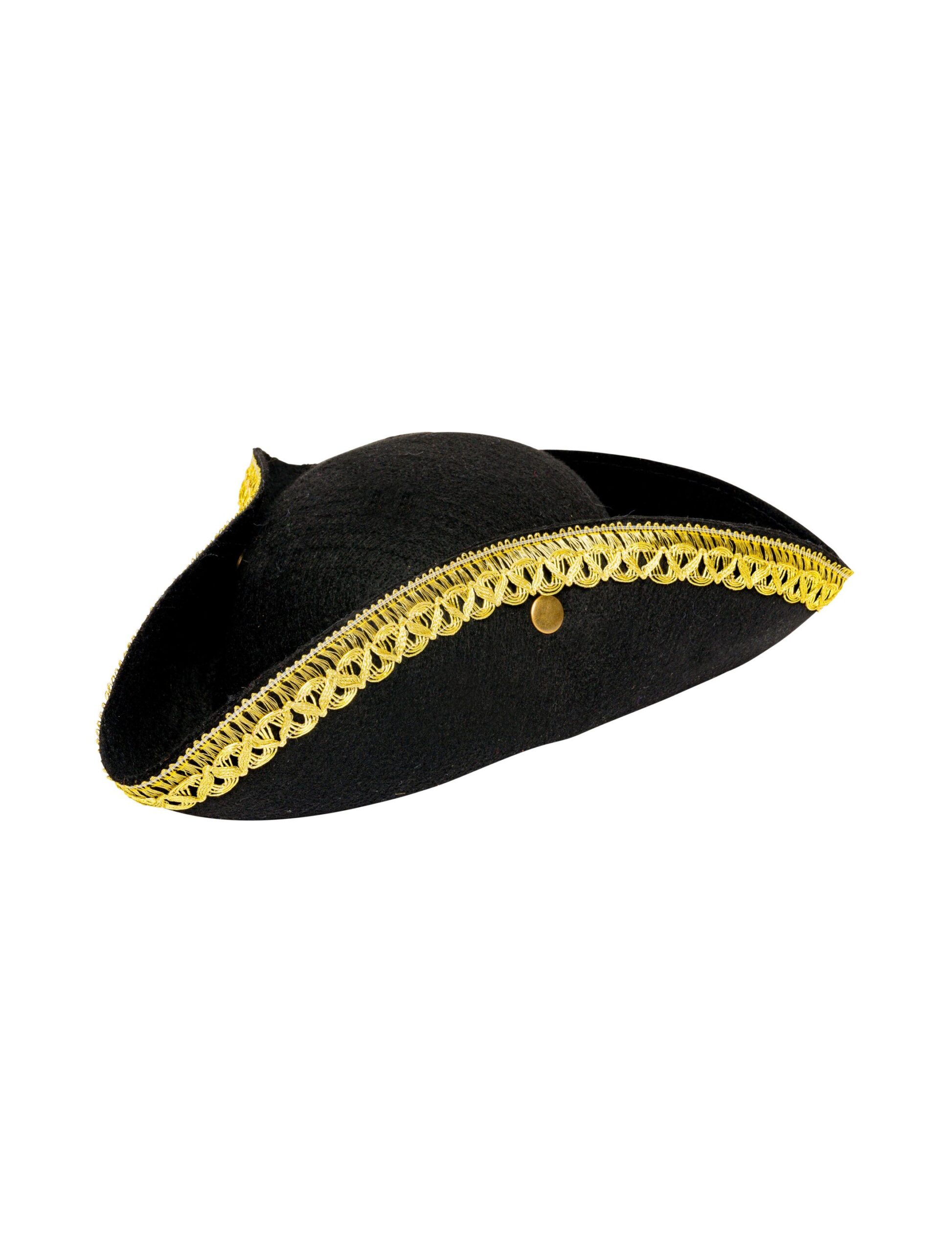 Dieser kesse Dreispitz mit seiner goldenen Borte darf bei keinem Piratenkostüm fehlen. Zudem schützt er die Frisur, wenn es beim Umzug Kamelle und Bonbons regnet. Aus leichtem Polyestermaterial gefertigt, sitzt er angenehm weich auf dem Kopf, ohne zu drücken. Mit zwei Druckknöpfen rechts und links lässt sich die Krempe nach oben klappen und befestigen, oder auch ein- oder zweiseitig herunterklappen.